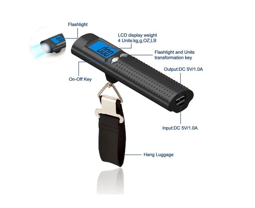 Travel Scale with Digital Display Built in 2600mAh powerbank your ultimate travel companion Does this sound like you? – Arrived at the airport to find out you over packed now you need to pay a huge airline luggage overweight fee? – Want to stop using your floor scale to weigh your luggage? – Tired of moving items from one luggage to another at the airport? – Would you like to make packing easier? No more extra baggage fees! Introducing your very own ELECTRONS Luggage Traveler Scale to the rescue! – Designed to be portable, lightweight and easy to use. – Built-in backlight for easy reading. – Built-in powerful flashlight to help you find your things when you’re in a poor lighted place. – Versatile with strap and not just stuck with a hook design. – Max weight 110lbs/50g. – Zero and Tare Function: Switch on/off (press for 2 seconds to turn off or it will auto turn off within 90 seconds of no use) and press again to show zero weight. – UNIT Function allows easy viewing between weight in LB, KG, G and OZ.