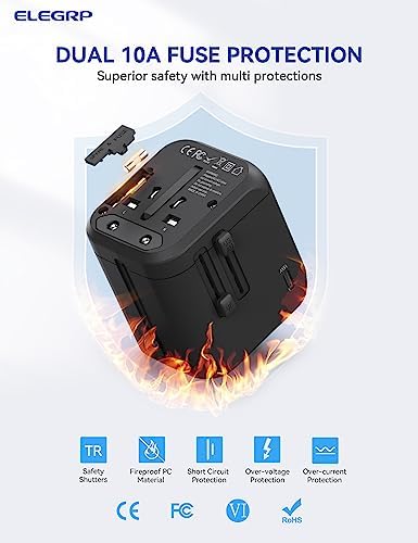 ✅【Upgrade Double 10A Fuse Protection Adapter】 This universal power adapter is designed with a spare fuse inside, more convenient to change the fuse. When over-current or over-voltage, free of worry. The travel adapter built-in safety shutters inside the jack field, protect users from direct touch of live parts to avoid electric shock. More importantly, it’s safety for children.