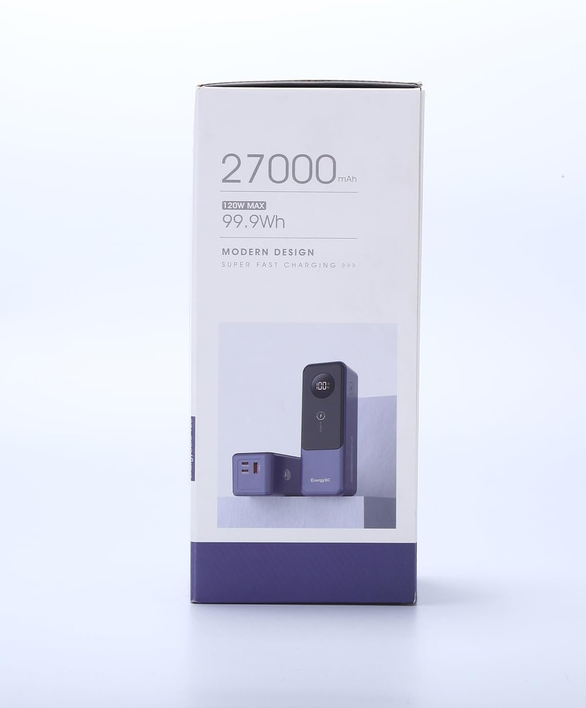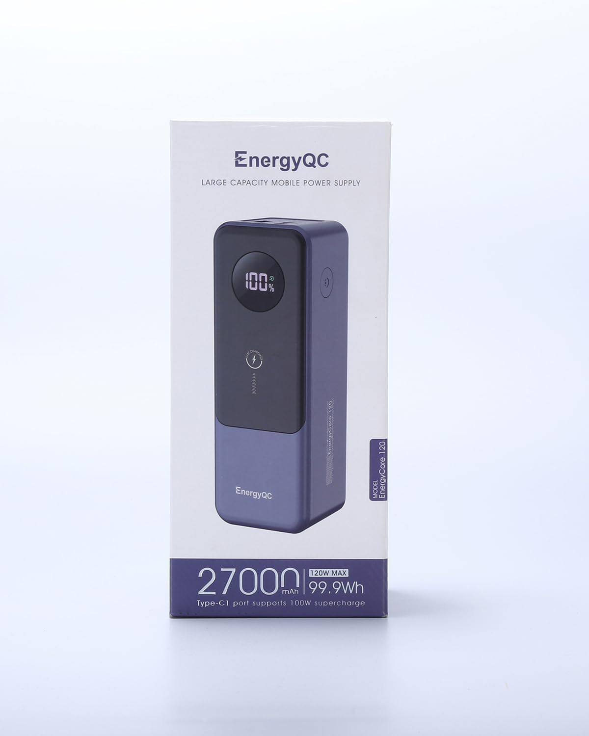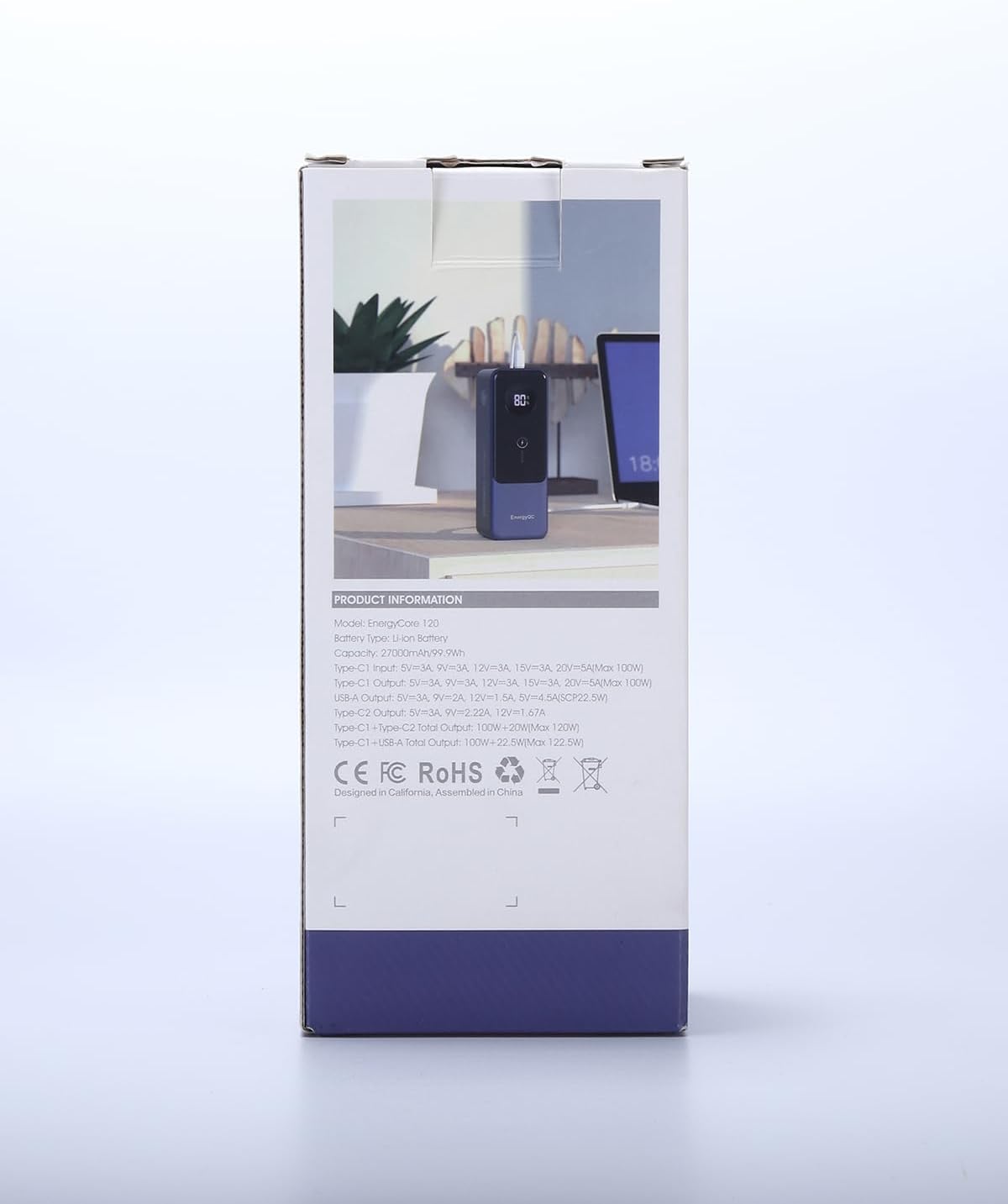 Model EnergyCore 120 Capacity 27000mAh/99.9Wh Battery Type Li-ion Battery Type-C1 Input 5V/3A,9V/3A,12V/3A,20V/5A(Max 100W) Type-C1 OutPut 5V/3A,9V/3A,12V/3A,20V/5A(Max 100W) USB-A OutPut 5V/3A,9V/2A,12V/1.5A,5V/4.5A(SCP22.5W) Type-C2 OutPut 5V/3A,9V/2.22A,12V/1.67A Type-C1+Type-C2 OutPut 100W+20W(Max 120W) Type-C1+USB-A OutPut 100W+22.5W(Max 122.5W)