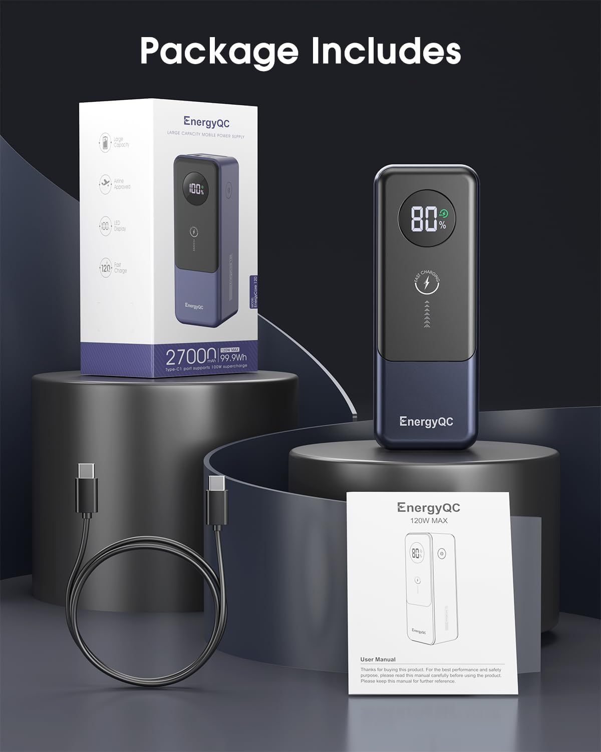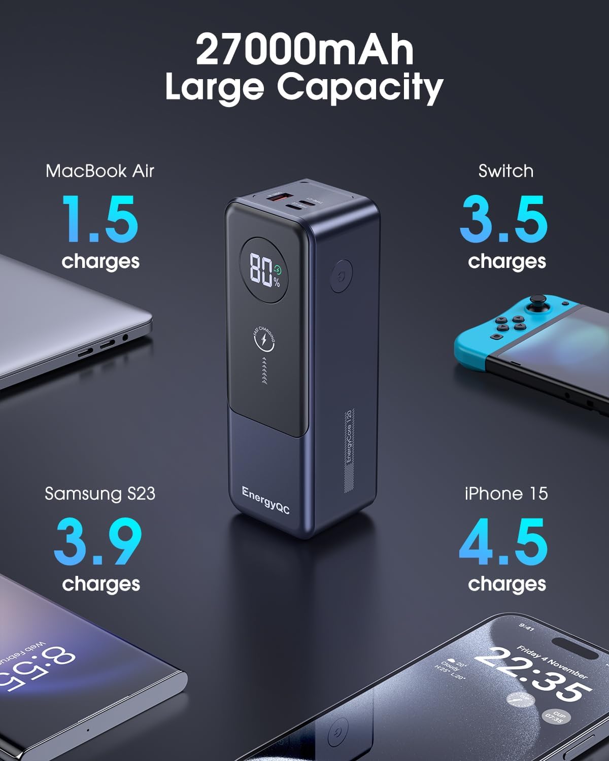 27000mAh Ultra Large Capacity: With a large capacity of 27000 mAh, this power bank can fully charge a MacBook Pro about 1.5 times, an iPhone 14 about 5 times, or a Samsung23 about 4.4 times. Ideal for daily use and quick charging during meetings, outdoor activities, and emergencies