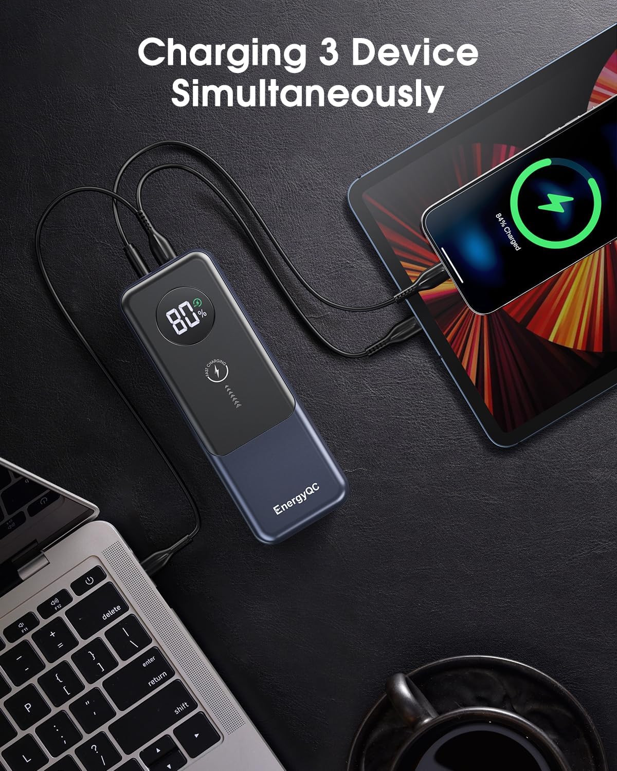Charging 3 Devices Simultaneously, Super Convenient: Equipped with two Type-C output ports and one USB-A output port, this power bank can fast charge up to 3 devices simultaneously, including laptops, tablets, and smartphones. Plus, it supports pass-through charging