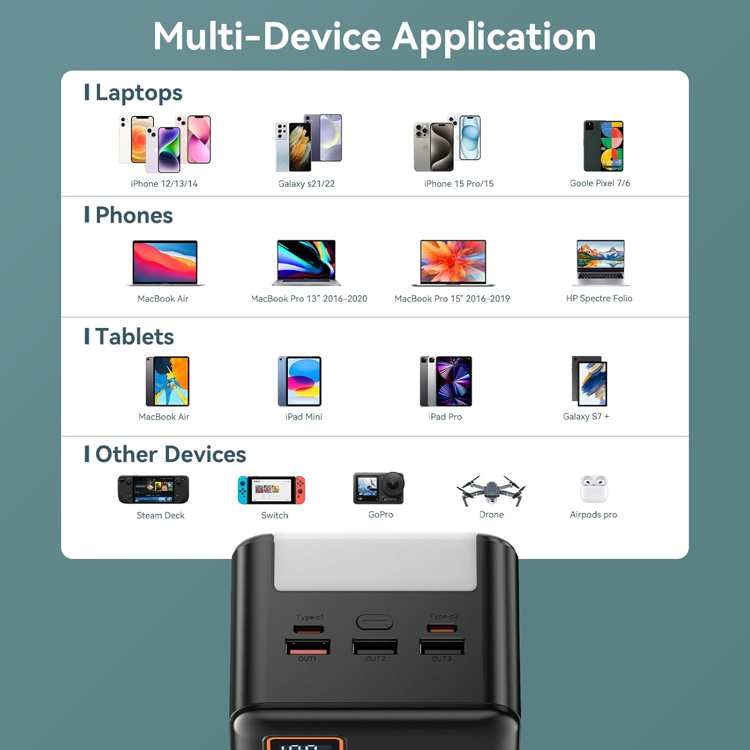 Broad Compatibility:This LED Display 72000mAh Power Bank is not only suitable for all mobile phones, tablets, most laptops, drone etc, but also for your low-current devices such as AirPods, bluetooth headphones, smart watches etc