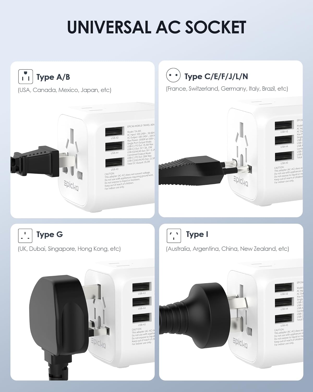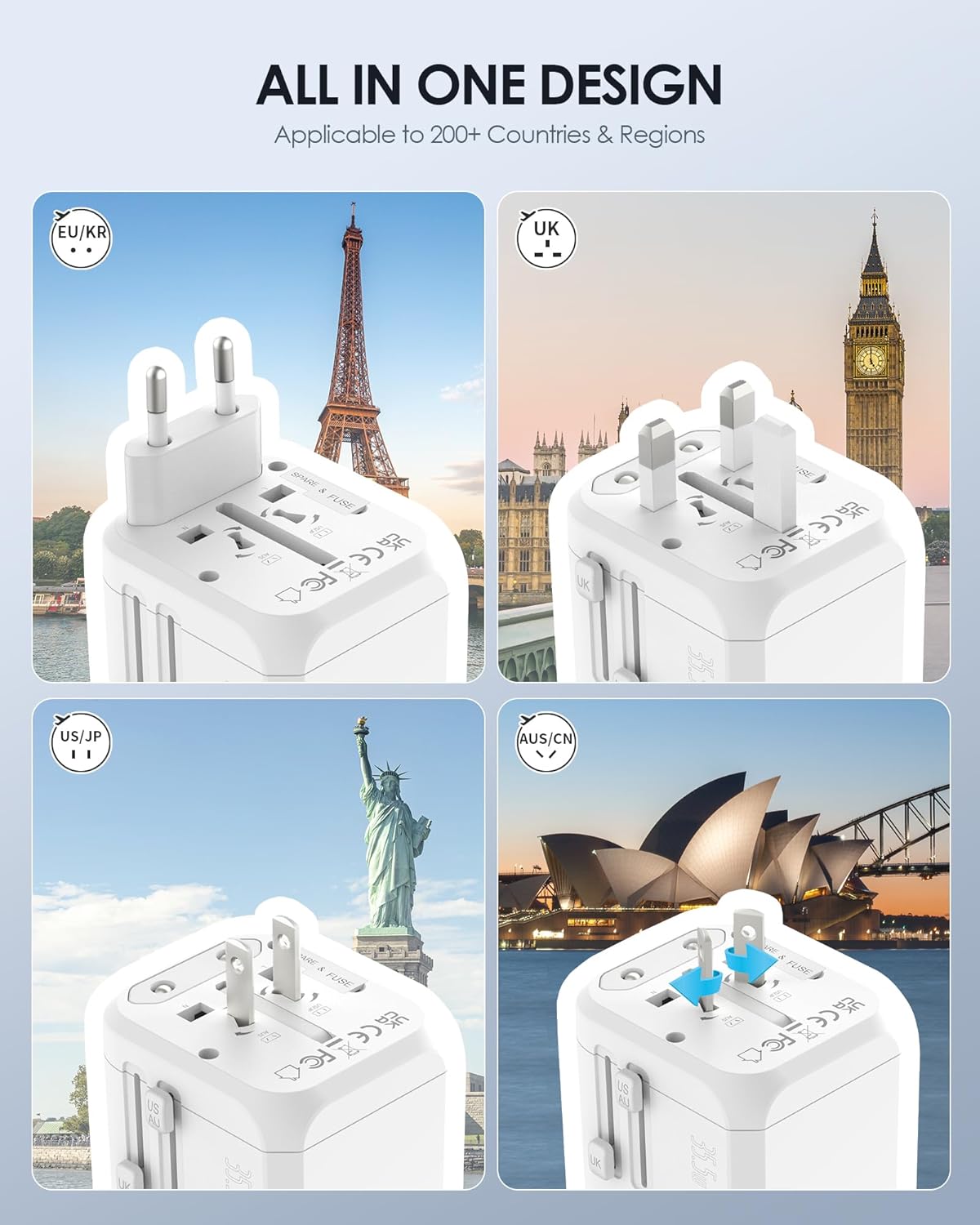 WORLDWIDE ADAPTER & TRAVEL ESSENTIALS – Our all-in-one adapter is equipped with 4 different plug types that could plug into the sockets of 200+ countries and regions: Type C (most popular type) for use in most of Europe, including France, Germany, Italy, Spain, Iceland, Greece, and many other countries; Type G for UK, Ireland, HK, Malaysia, Singapore; Type I for China, Australia, New Zealand, Argentina; Type A for USA, Mexico, Canada, and Japan. It does NOT work with Type D (India) or Type M (South Africa) sockets.