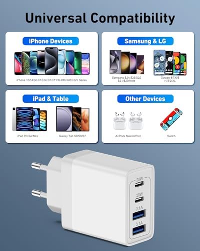 40W Multiport Fast Charging: Universal European travel plug adapter equipped with dual USB-C ports and dual USB-A ports for with a total power of up to 40W. The USB C port output of power is 20W, and the USB A port is 3.1A/5V. Paired with the provided long 6FT USB C to C cable charge your iPhone 15 from 0% to 60% in just 30 minutes, 3X Faster than a original wall charger.