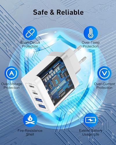 Safe & Reliable: Europe travel adapter built-in multiple safety protection system and smart IC chip, automatically recognize the phone model, protect your device against from overcharge, overheat, short circuit. EU Type C fast charging block brick automatically stop charging when fully charged, to protect your connected device.
