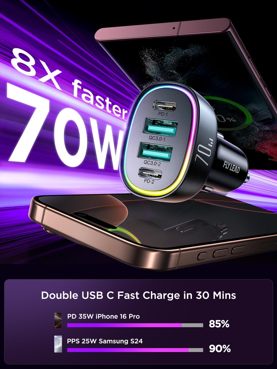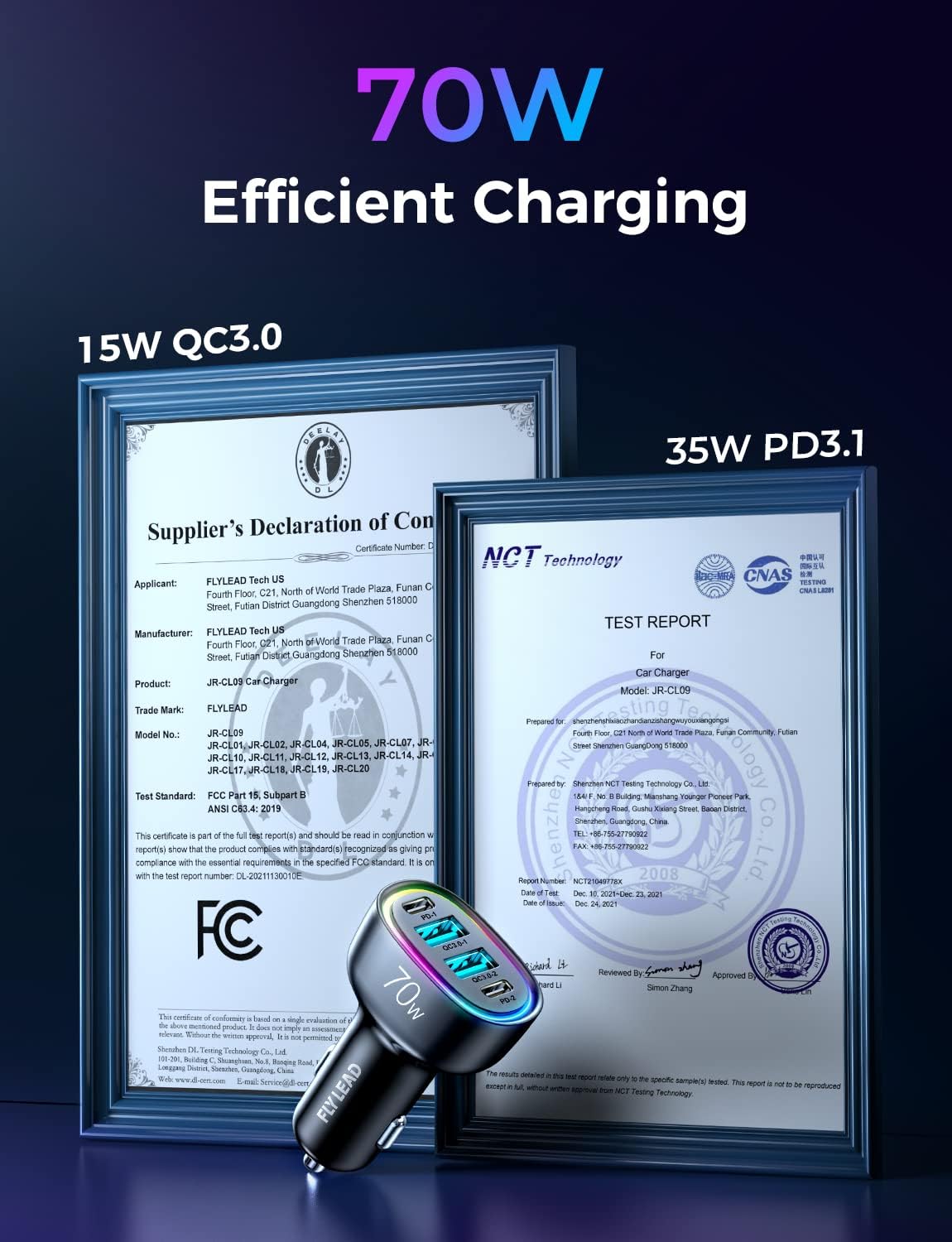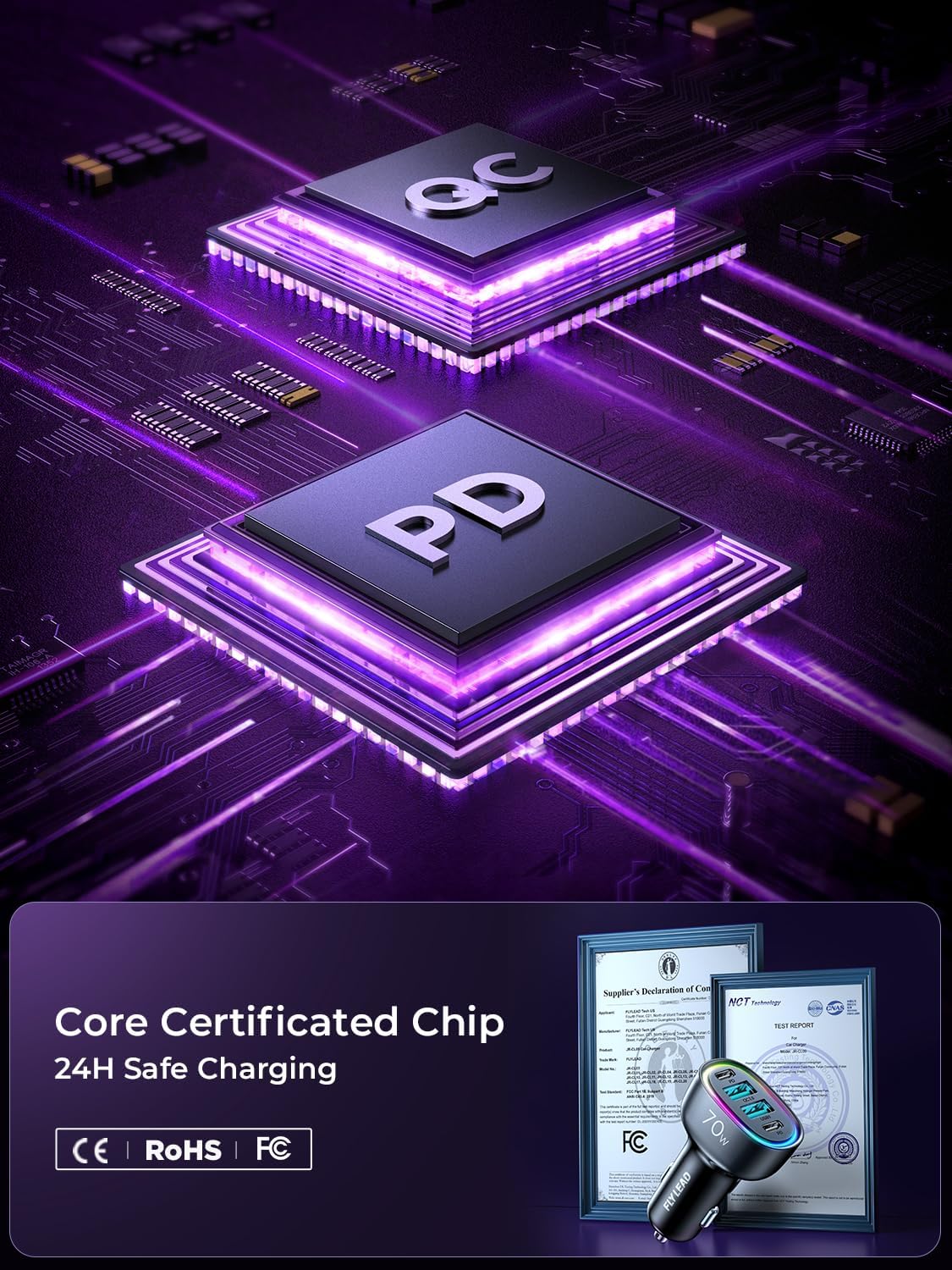 UL and FCC Certification: FLYLEAD car cigarette lighter fast charger has provided the advanced intelligent circuity safety system to prevent short-circuit, overheating, overcurrent, and overcharging. USB C car charger can automatically identifies any devices you plug in and distributes the optimal charging efficiency for you