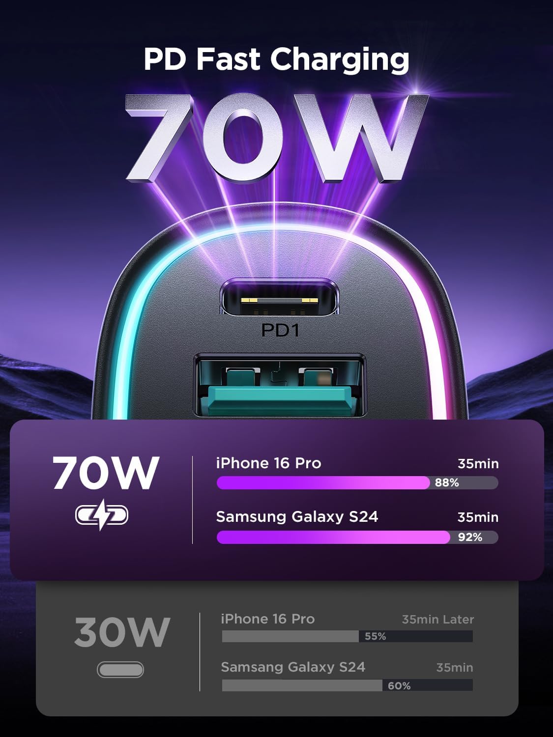 35W USB C &18W USB A: PD 3.0 port output 35W(max), 5X faster than 2.1A charger, charges iPhone 15 Pro from 0-50% in just 20 minutes. QC 3.0 port output 18W, charges most Android devices from 0% to 60% within 35 minutes