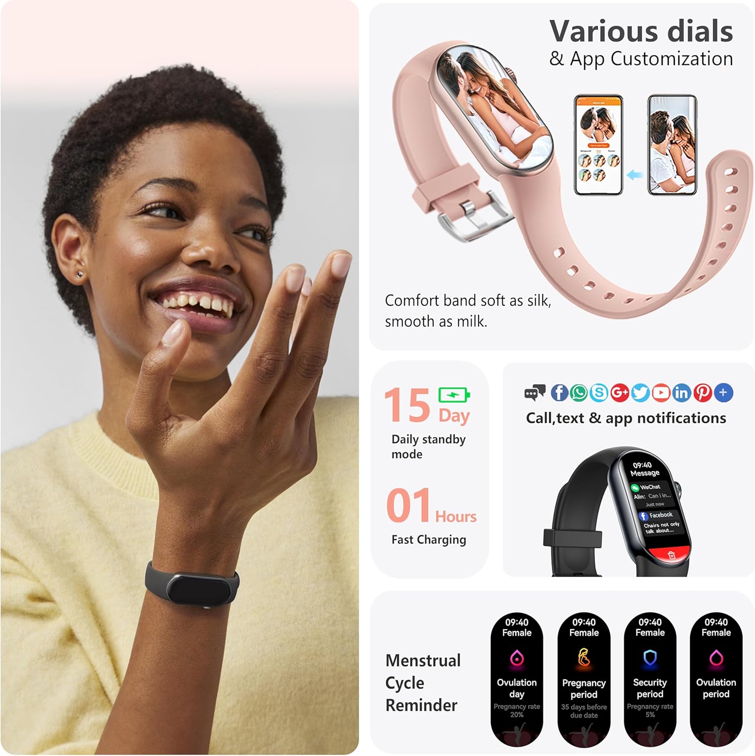 Smart Features: FITVII Ole fitness watch offers a variety of intelligent functions. Customize your watch face, receive call and message notifications, find your phone, check the weather, get drinking and sedentary reminders, set alarms, control your music, and track your menstrual cycle.