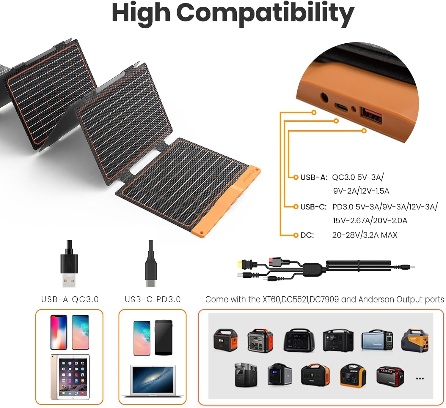 Equipped with QC3.0 Max 18W USB-A, PD3.0 max 40 W USB-C, MAX 60W DC(20V-28V) output ports, can directly connect and charge small to medium solar generator (lower than 300Wh),battery packs,computer,iPads,cellphones(Android and Apple) and other daily electronic devices. Please note the maximum voltage and current per port.