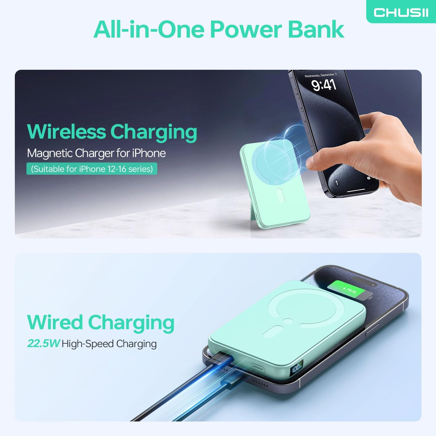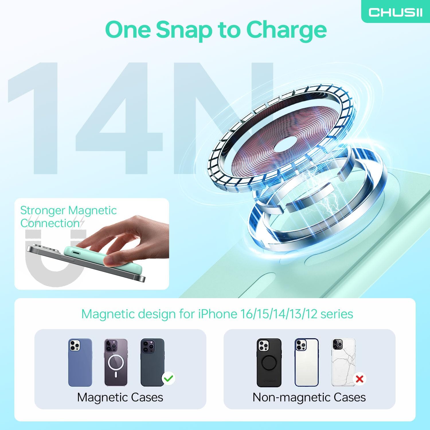 Wireless Portable Charger- Not Constrained by “Cable”: CHUSII wireless powerbank is an ultimate go-to solution to reduce wire clutter and reduce the annoyance of plugging/unplugging charging cables. As soon as attach the battery pack, your phone recognises it and starts charging wirelessly. This feature has eliminated the hassle of dealing with loose cables and connectors, providing a seamless charging experience. The freedom it offers from wall sockets and cables allowing you to fully immerse yourself in an uninterrupted gaming experience