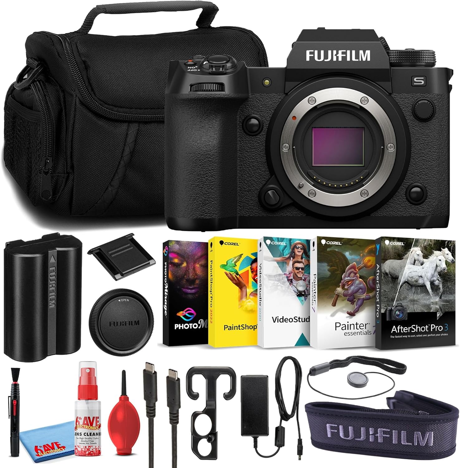 This Fujifilm Mirrorless Digital Camera Bundle Includes: Fujifilm X-H2S Mirrorless Digital Camera (Body Only) (Black) + Corel Photo Editing Essentials Software + Large Padded Digital Camera Case + Lens Cap Keeper Strap + Deluxe Camera Cleaning Kit