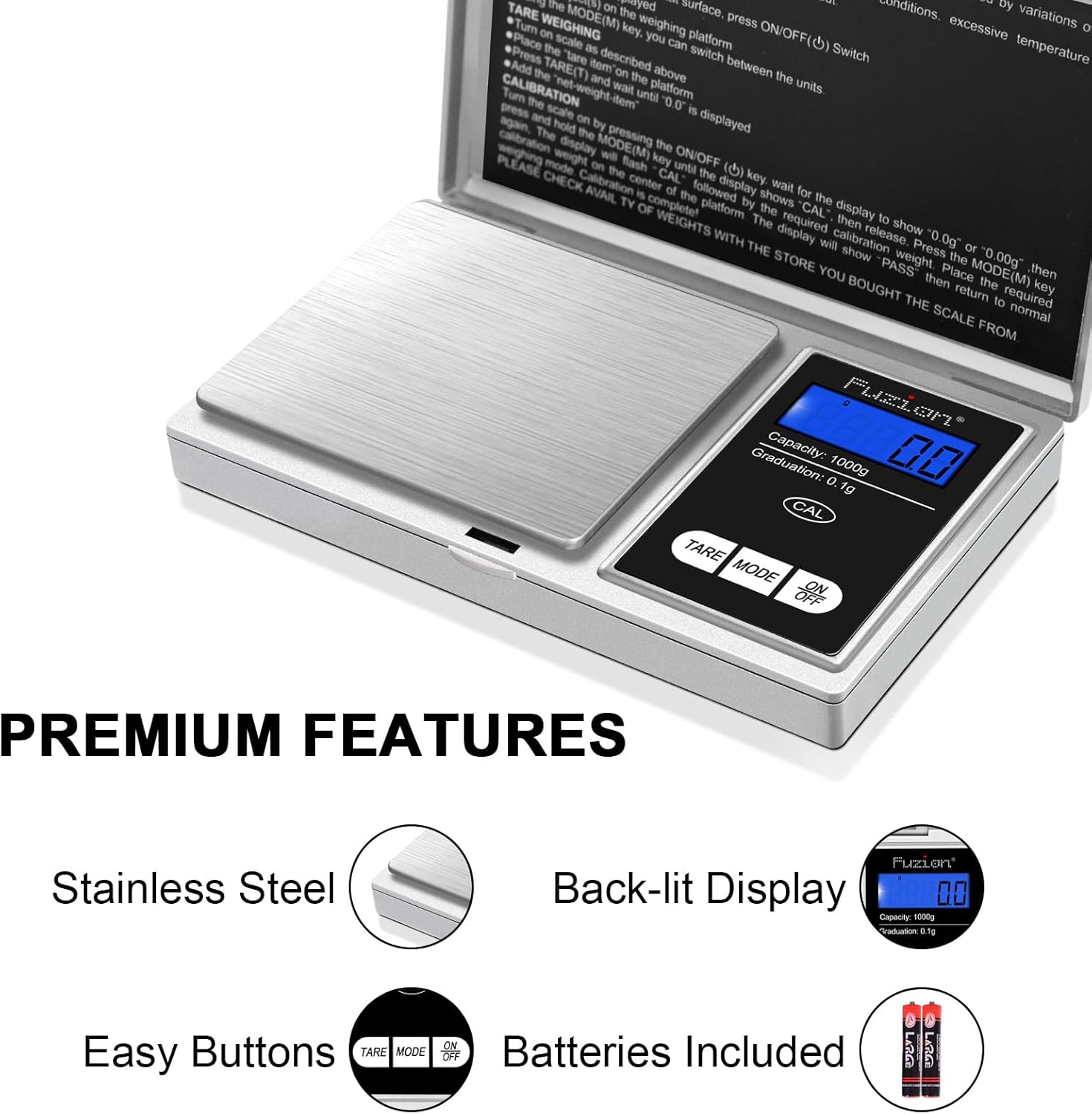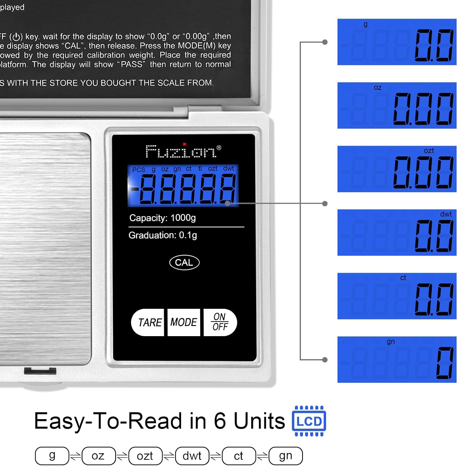 High Accuracy: This gram scale has 1000 gram max weight capacity and reads weights in increments of 0.1g. Min. weight recommendation: 0.5g. High precision sensors make sure the accurate weighing. 6 weigh modes available – g/ oz/ gn/ ct/ dwt/ ozt.
