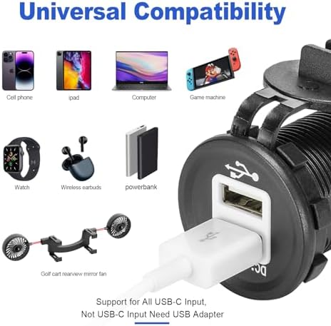 【Universal Fitment】: Our golf cart universal fast charge socket fit for Club Car EZGO Yamaha, 12V-24V power input, 5V 3.1A waterproof power outlet, this usb outlet also compatible with Car, Truck, van, Boat, RV, UTV, ATV, Motorcycle, SUV, etc.