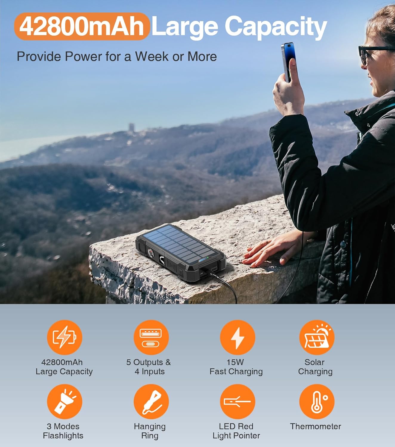 [42800mAh Large Capacity] The power bank has a 42800mAh premium battery, providing extra-long charge time with one full charge, supporting a week of power or more. Along with its multiple outputs, it keeps all your device batteries green easily. Sharing it with your families and friends is also a great choice.