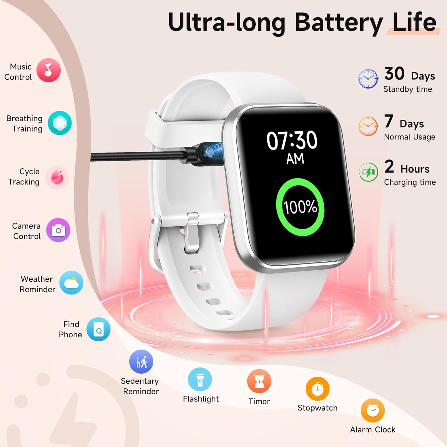 【Versatile Functions & Outstanding Battery Life】The Women’s Smartwatch boasts a range of other features, including Medication reminders, Sedentary Reminder, Flashlight, Weather forecasts, Music and Camera control, Alarms, Stopwatch, Timer, Motion Recognition, Breather guide, Raise to wake, Find phone functionality, and more. With a quick 2.5 hours of charging, the smartwatch boasts a remarkable 7-day battery life with typical use and up to 30 days of standby time.