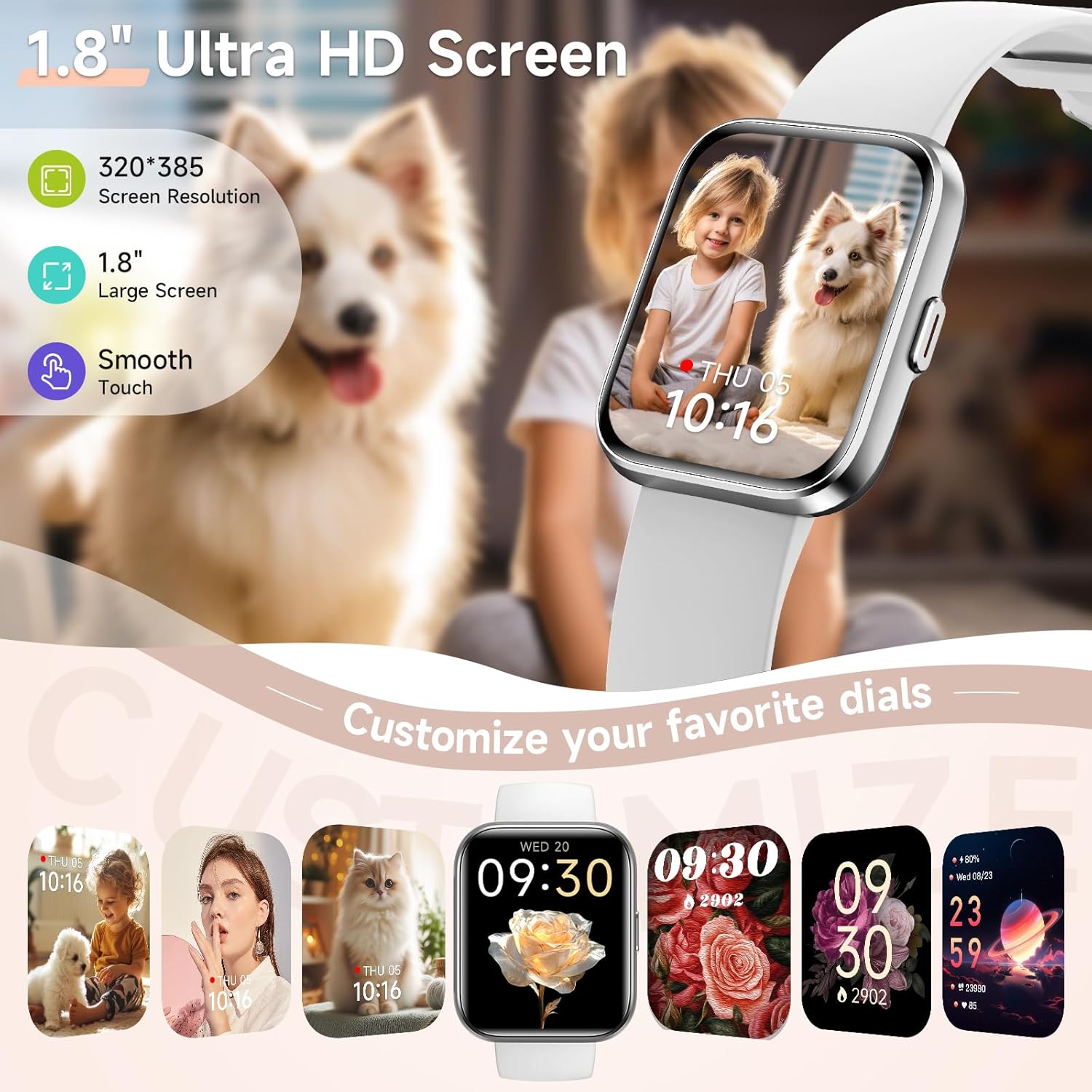 【1.8″ HD Display & Personalizable Watch Faces】The womens smart watches features 1.8″ HD touch screen with high sensitive, bring you a different visual feast. Express your personality with 100+ free watch faces and fully customizable watch faces on your own.