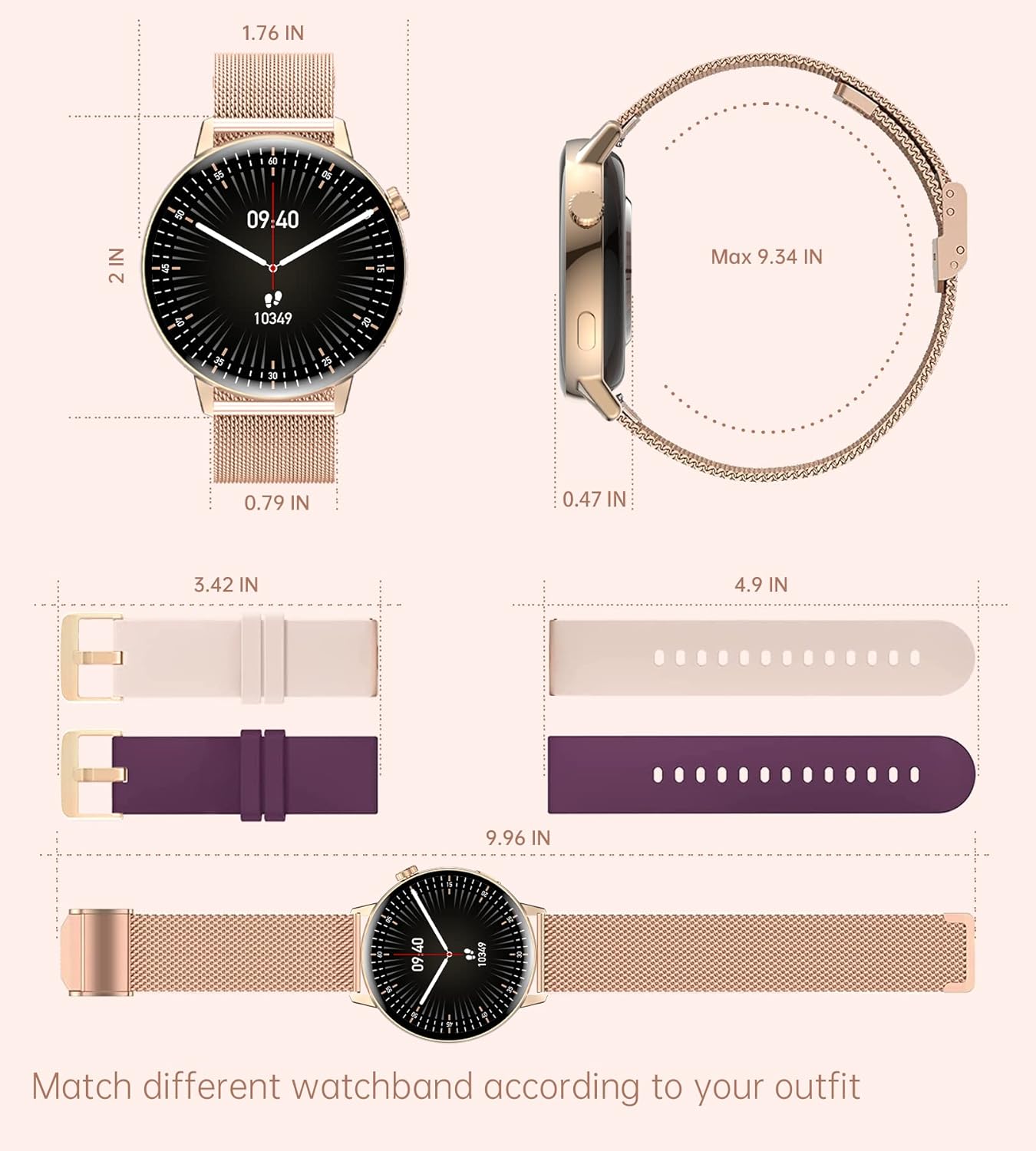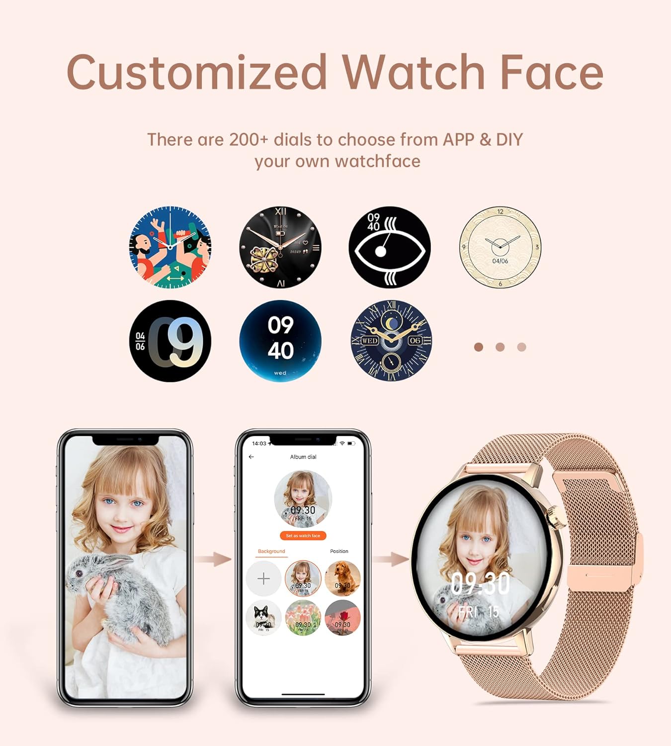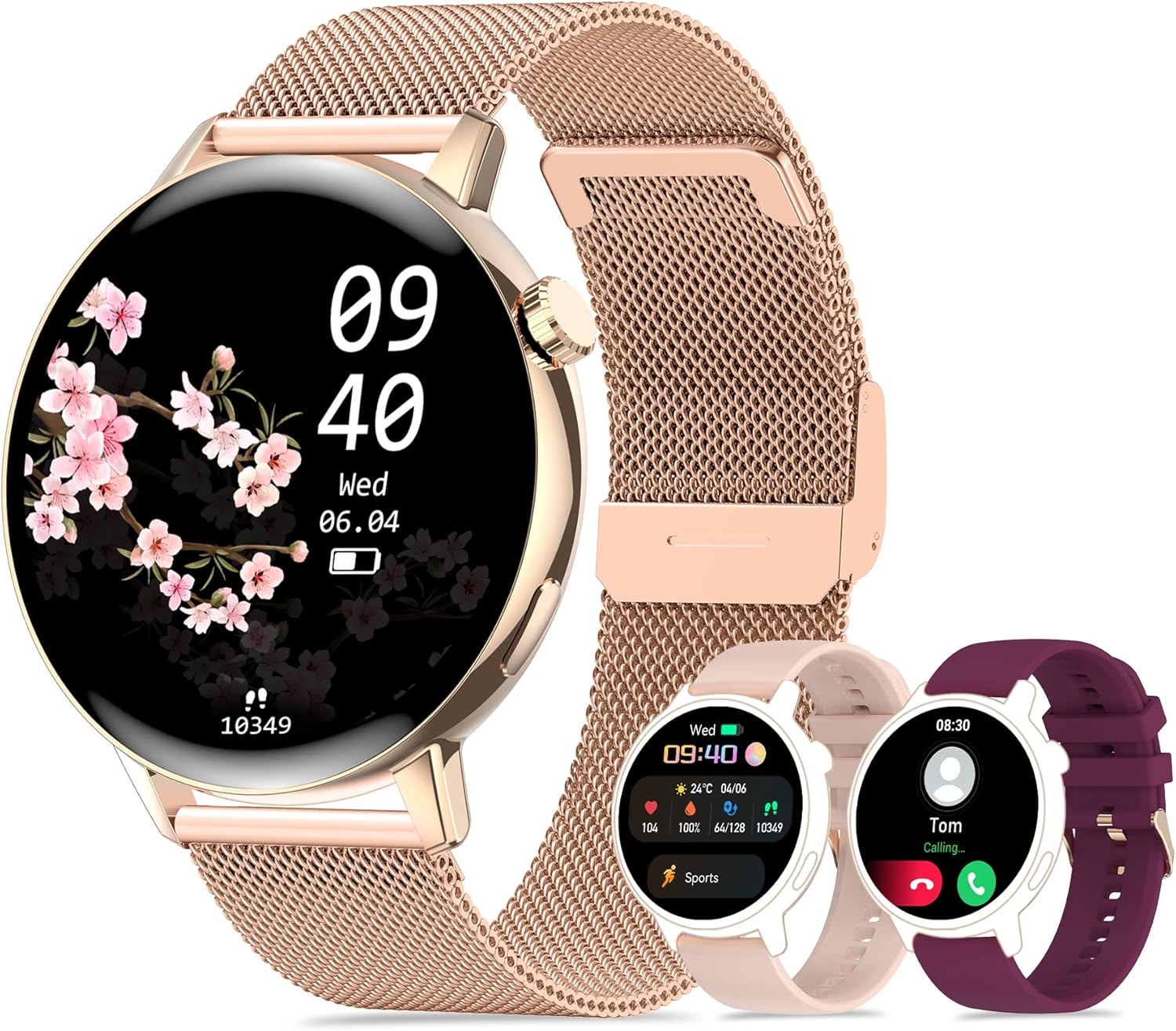SMART WATCHES FOR WOMEN: 1.32″ 360*360 pixel round full touch color screen covered with gold metal frame. The smartwatch includes 4 default dials, and there are 200+ free watchface in the APP to change. You can also upload any picture, such as your family or pets to create your personalized dial. 1 Smart watch body comes with 3 bands, the rose gold stainless steel one is exquisite, while the pink and burgundy silicone bands are more casual, switch between elegant and sporty to match your dress.