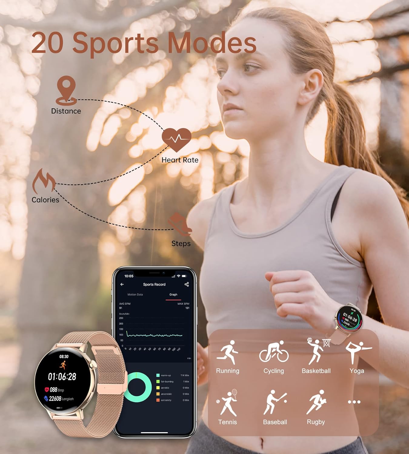 UPGRADED SMARTWATCH: As your personal smart assistant, smartwatch has a variety of useful functions. Activity tracker (pedometer, calories, distance), 20 sports modes, health monitor (heart rate, blood oxygen, blood pressure), sleep monitor (deep/light sleep, awake), women’s health, water drinking & sedentary reminder, music and camera controls, alarm clock, stopwatch, timer, weather report, raise to wake, brightness adjustment, find phone and many other functions for your daily needs.