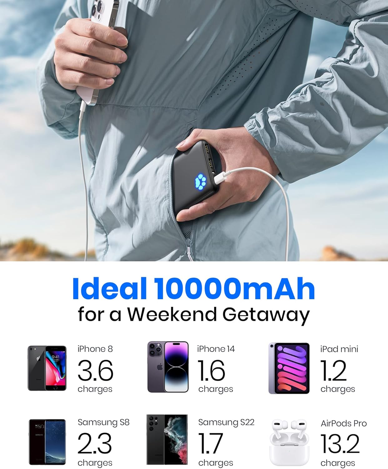 [2-Pack Ultra Slim 10000mAh] Get 2 chargers at onceβthe thinnest 10000mAh power bank on the market, easily slip it into any of your pockets or bags. Enjoy the daysβ worth of charging capacity, enough to top up iPhone 8 3.3 times, Samsung S22 1.6 times, or AirPods Pro 11.5 times.