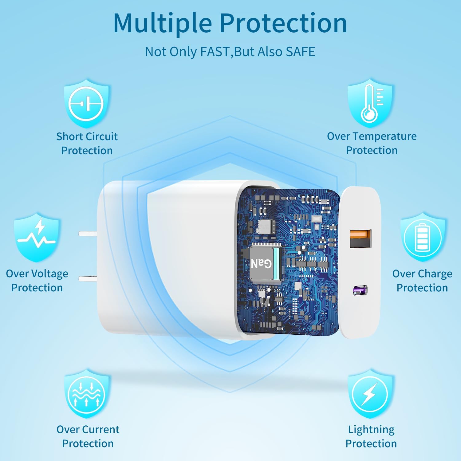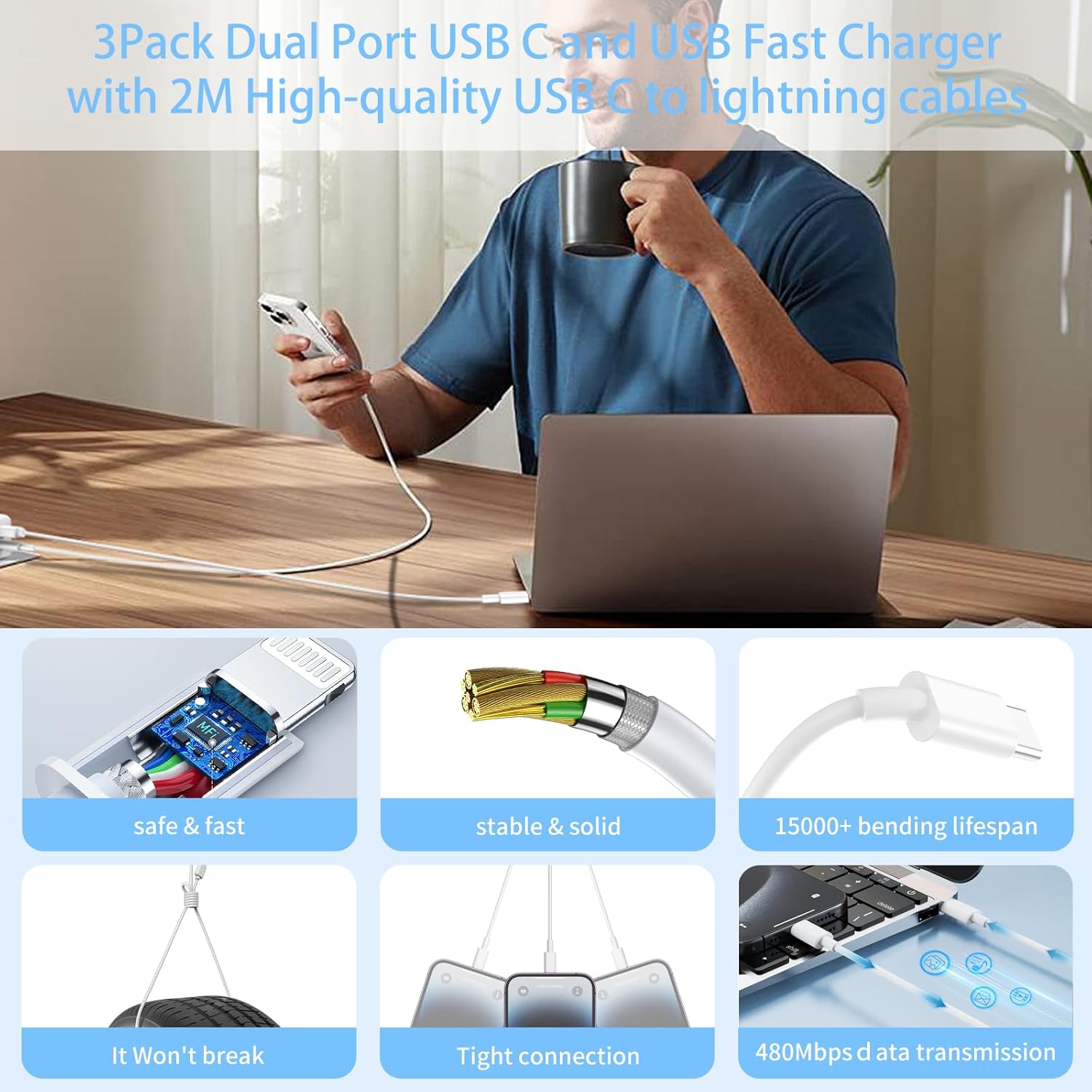 【Universal Compatibility】Our USB C and USB Dual port fast charger plug compatible with All Smartphones,Tablets etc. Supports fast charge for iPhone 15/14/13/12/11/Pro/Max/Plus/XR/XS/X/8/7, iPad Air/iPad Pro/iPad Mini, Samsung Galaxy and more. (Comes with USB C to lightning fast charging cable, does not include USB A to lightning/USB C cable and USB C to USB C cable