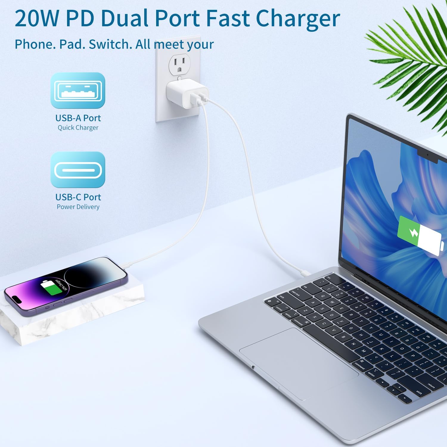 【iPhone 14 Charger】Our iphone charger with USB C(20W max)+USB A(18W max)Dual Port can fast charge 2 devices simultaneously, it’s still 3X faster than the 5W iphone charger. Minimize waiting time and frees you from messy chargers with various interfaces