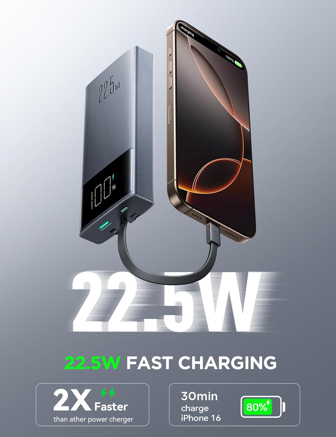 PD 22.5W Fast Charging : The USB A port of the portable charger power bank supports up to 22.5W fast charging output, allowing your iPhone 16 to fully charge 50% in 30 minutes, nearly 2x faster than other traditional chargers, greatly reducing your charging time.