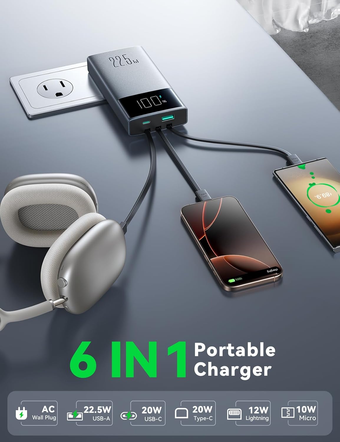 6 in 1 Portable Charger : JOYROOM 10000mAh portable charger has a wall plug and built in 3 cables (iOS, Type C, Micro), USB A and USB C port, solve all device charging problems at once