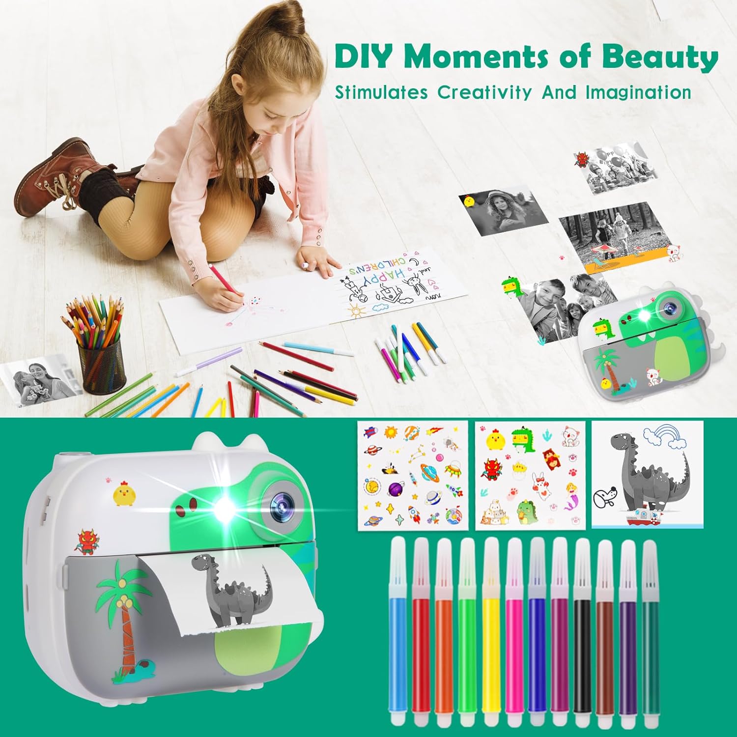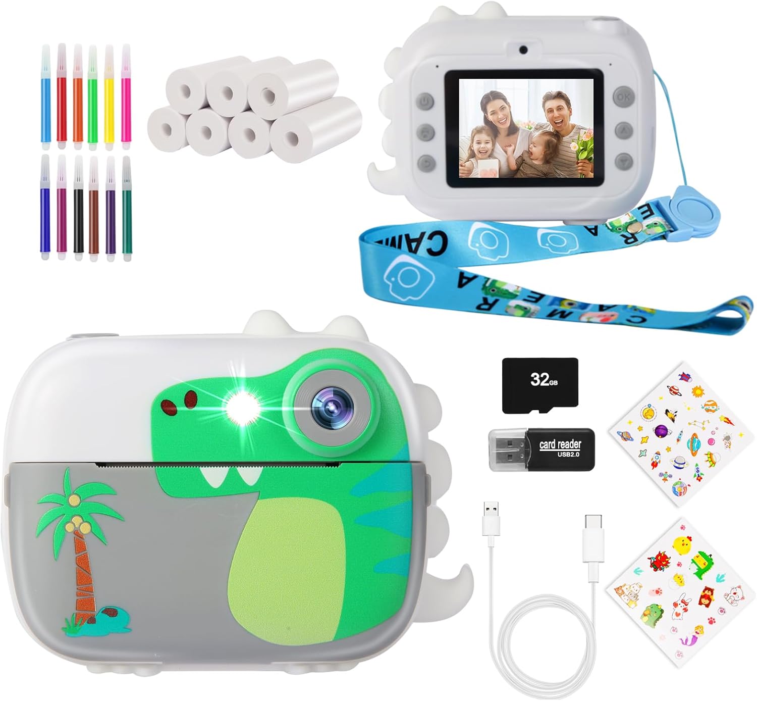【PACKING LIST & 100% SATISFACTION SERVICE】Packing List: 1 Instant Camera, 7 Rolls of Printing Paper, 12 Color Pens, 32GB Card, Lanyard, Card Reader, USB Type-C Cable, Instruction Manual. Kids can quickly print when they receive it and DIY doodle the printed photos. If you have any dissatisfaction with the product, please feel free to contact us, we will provide 100% satisfaction within 24 hours!