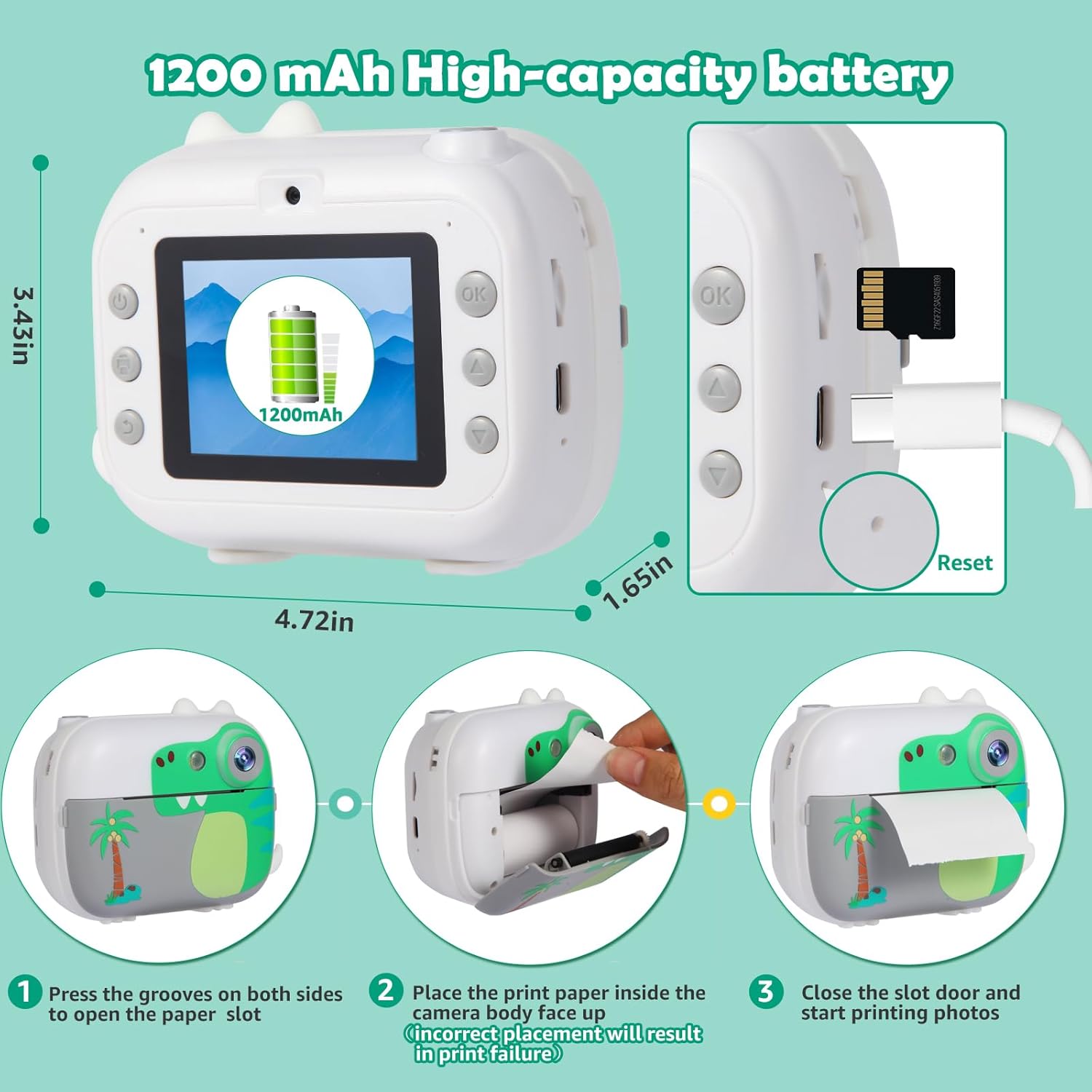 【Long Battery Life Kids Camera Instant Print】 Built-in 1200mAh rechargeable battery, the camera can be used for 2-5 hours after a full charge. Comes with a 32GB memory card that can store thousands of photos and videos. Comfortable lanyard for easy carrying. Perfect for kids to use on campus, traveling, party, picnic. Designed for small hands, easy to carry and durable using the included lanyard. Equipped with 32GB large capacity TF card and 7 rolls of replaceable thermal printing paper, long lasting use without worry.