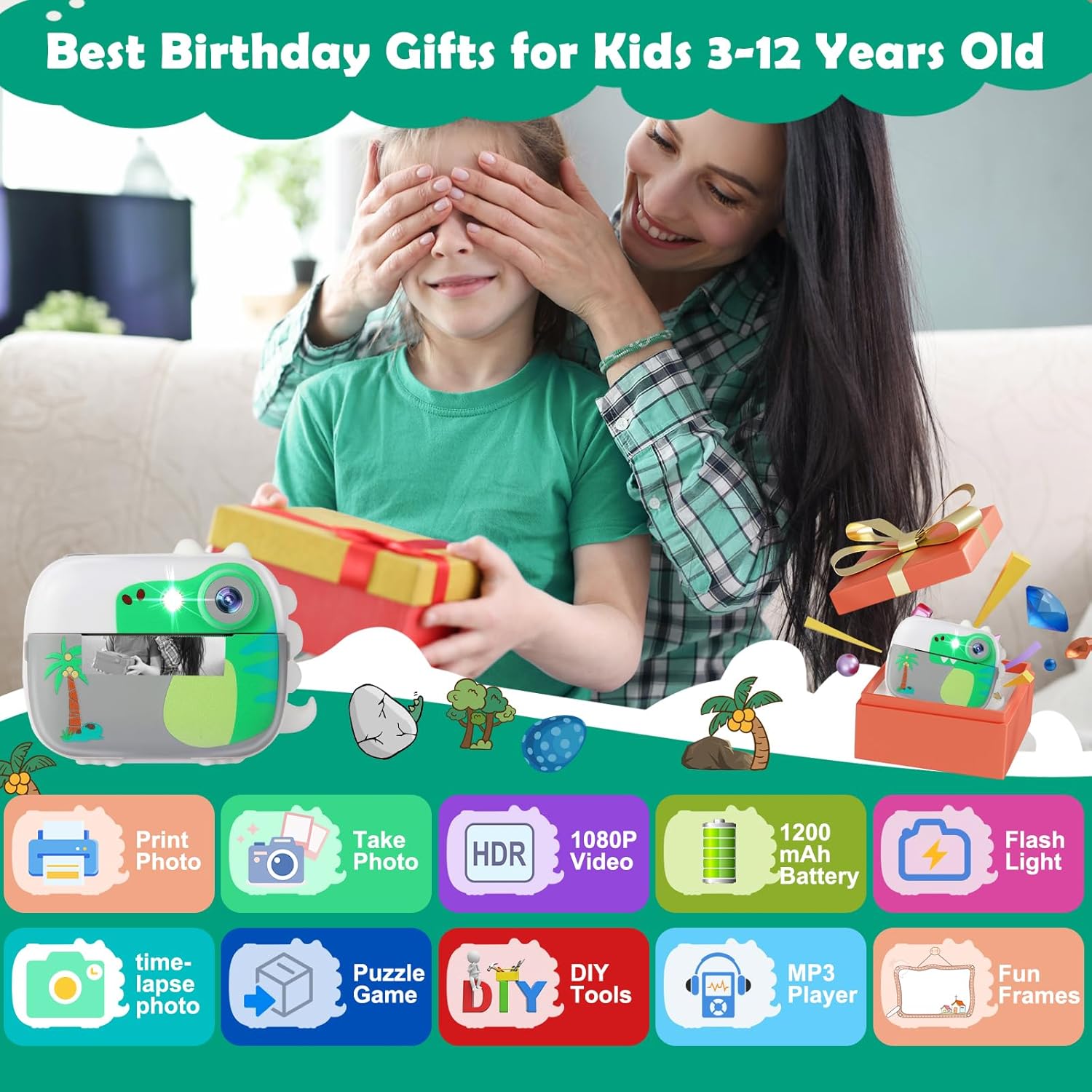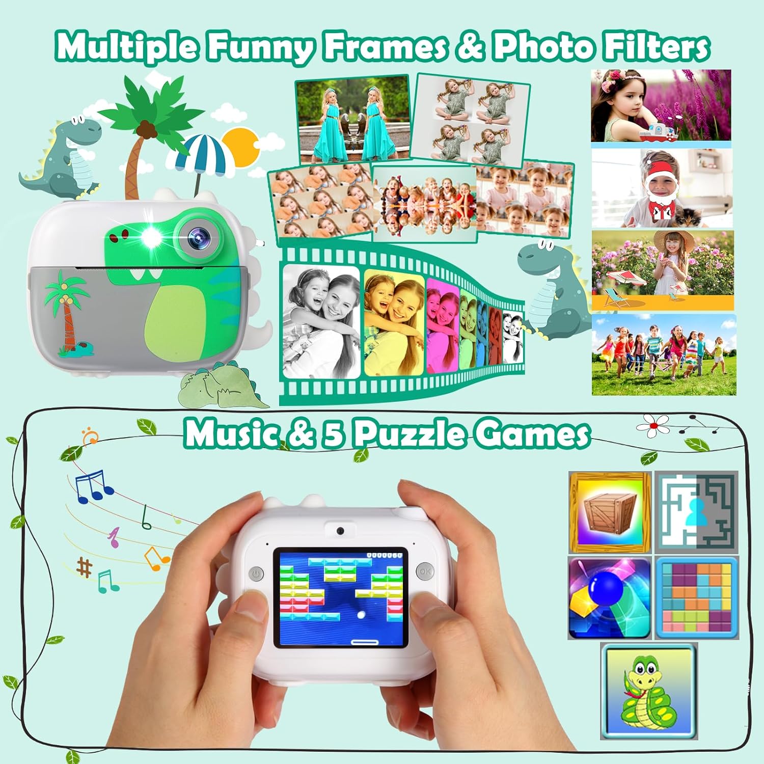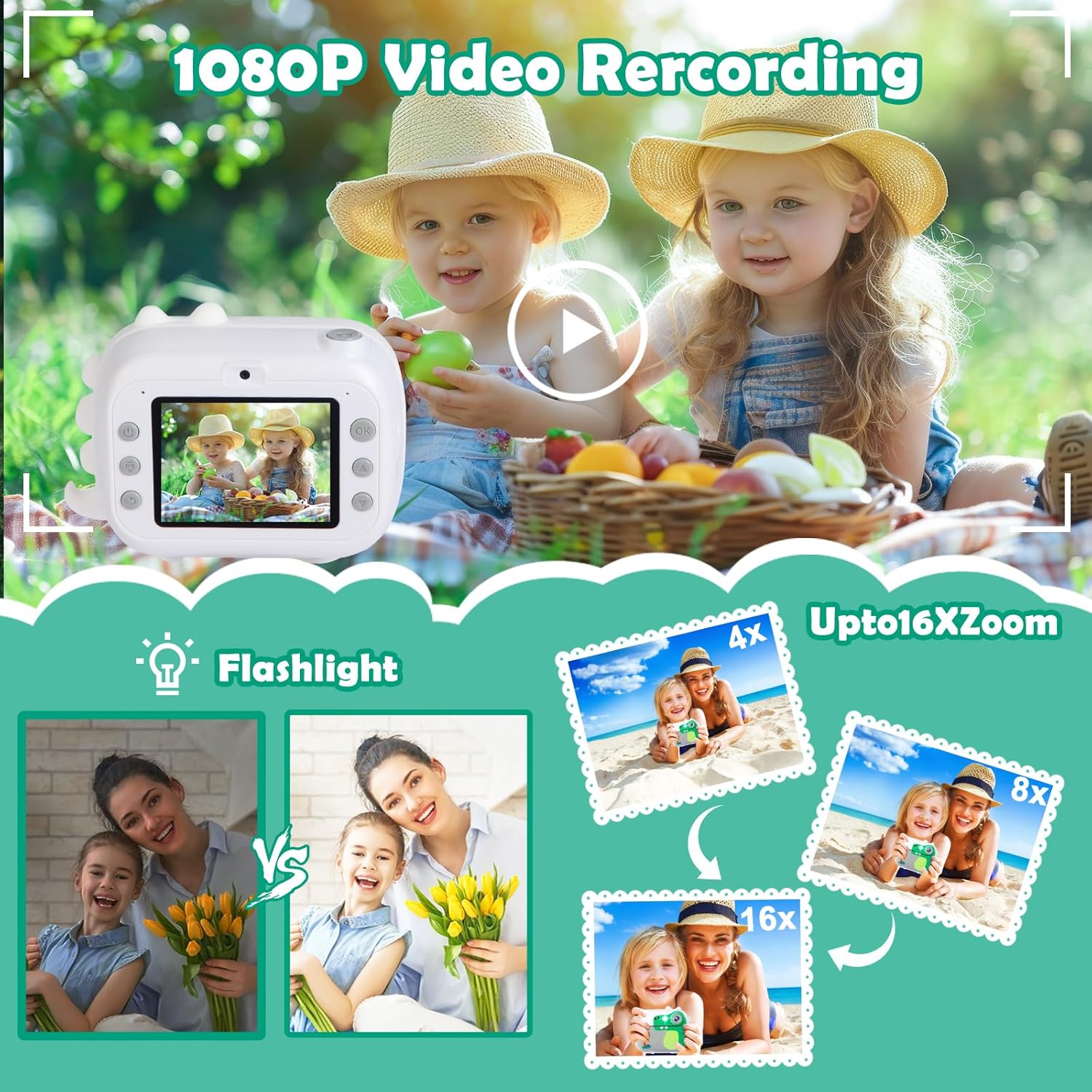 【Multi-functional Kids Digital Camera】 Equipped with 2.4-inch IPS eye-protecting screen, supports 1080P video recording and playback photo self-selected printing, 4 different print densities and 2 print modes, a variety of fun photo frames filters and puzzles, timed photo taking, continuous photo shooting, 16x zoom, loop shooting, music player, so kids can enjoy more photo taking gameplay and leisure fun.