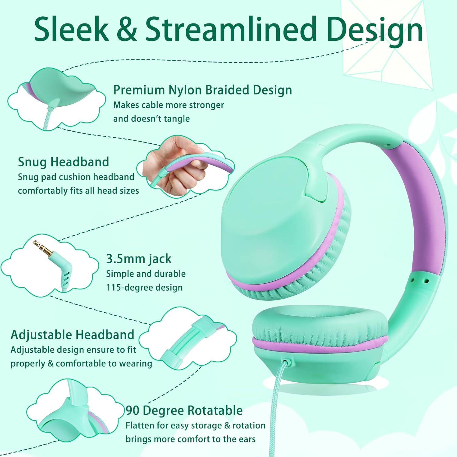 Sterep Sound:High-quality stereo with rich and clear dynamic sound.Superb sound quality brings clear tone and 94dB Volume Limit. Over-ear Headphones with Ergonomic Design: the high-soft ear cushions are comfortable to wear for long time. The ear cups can swivel by 98 degree that you can make your travel easily,because it can flat for easy storage,it is convenient to carry,you can easily put it in the suitcase and bag. The Soft oval-shaped earpads can completely cover your ear to reduce pressure for extra comfort. Adjustable design ensure to fit properly & comfortable to wearing,the cord is nylon braided ,with 4.2 feet lenght, it is very durable and tangle-free,design for kids ,children ,girl ,boys, tolddlers and school.