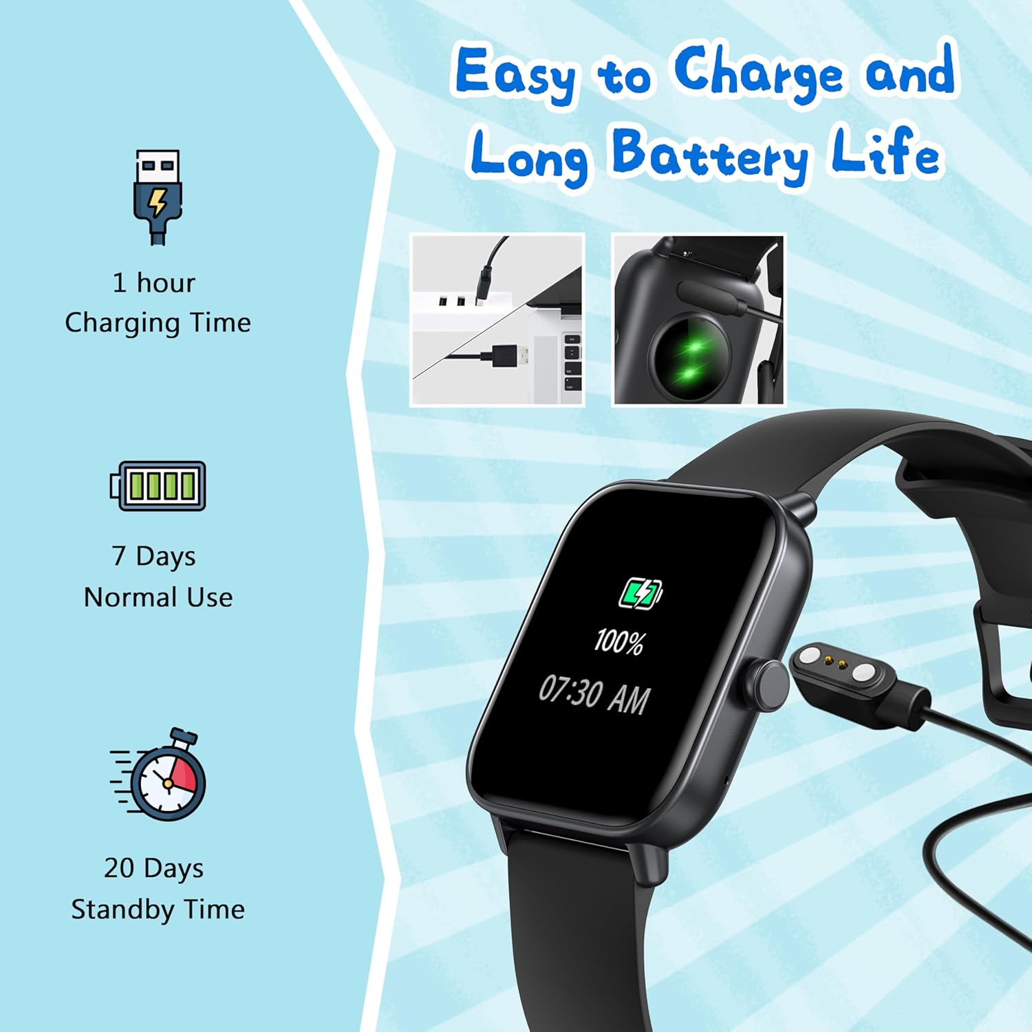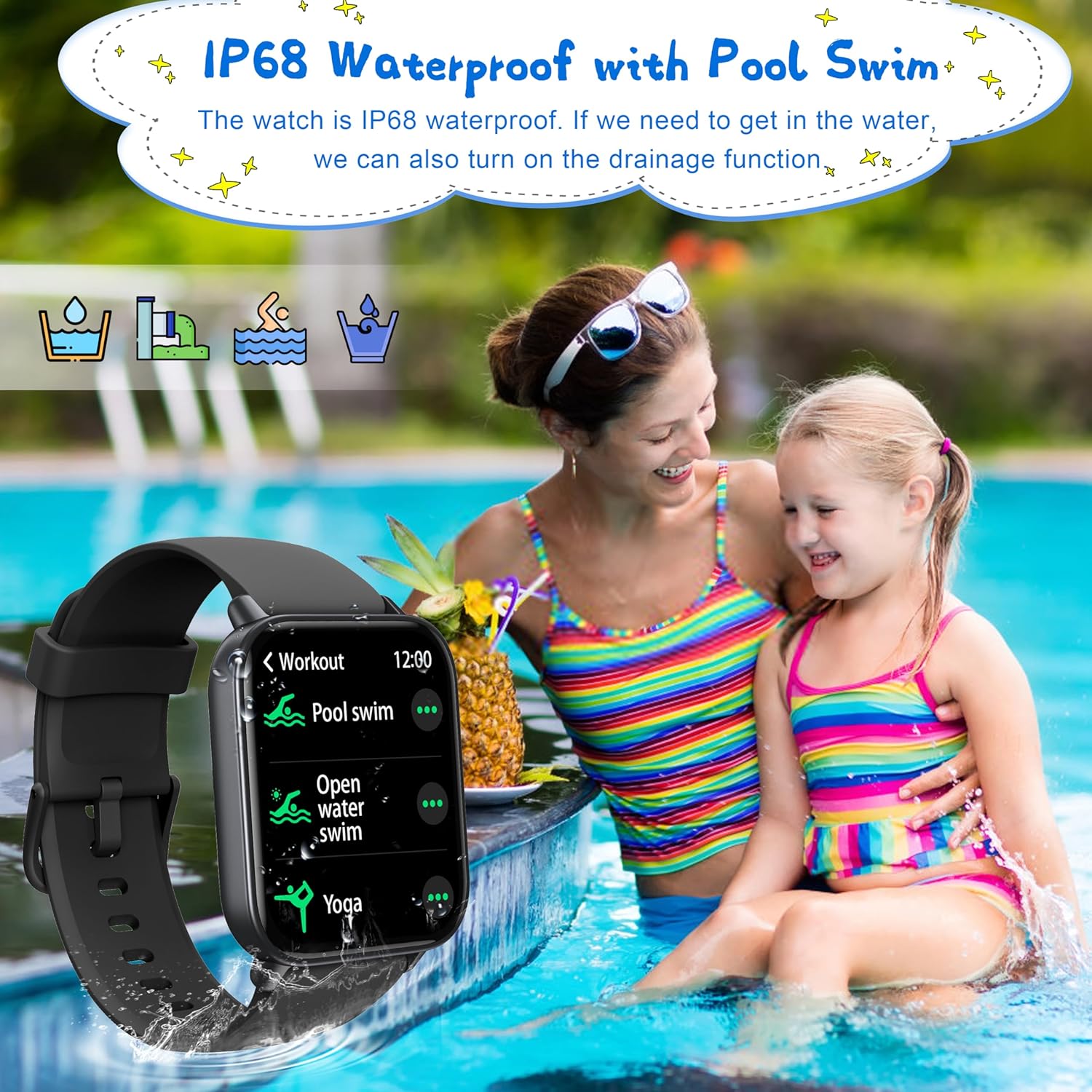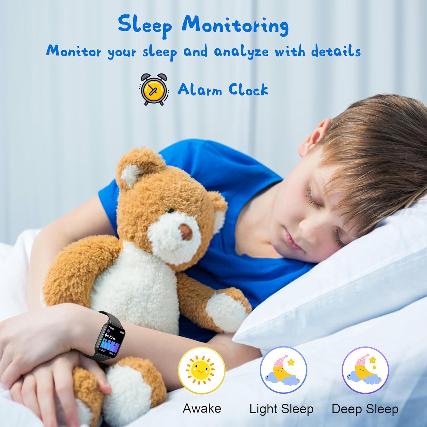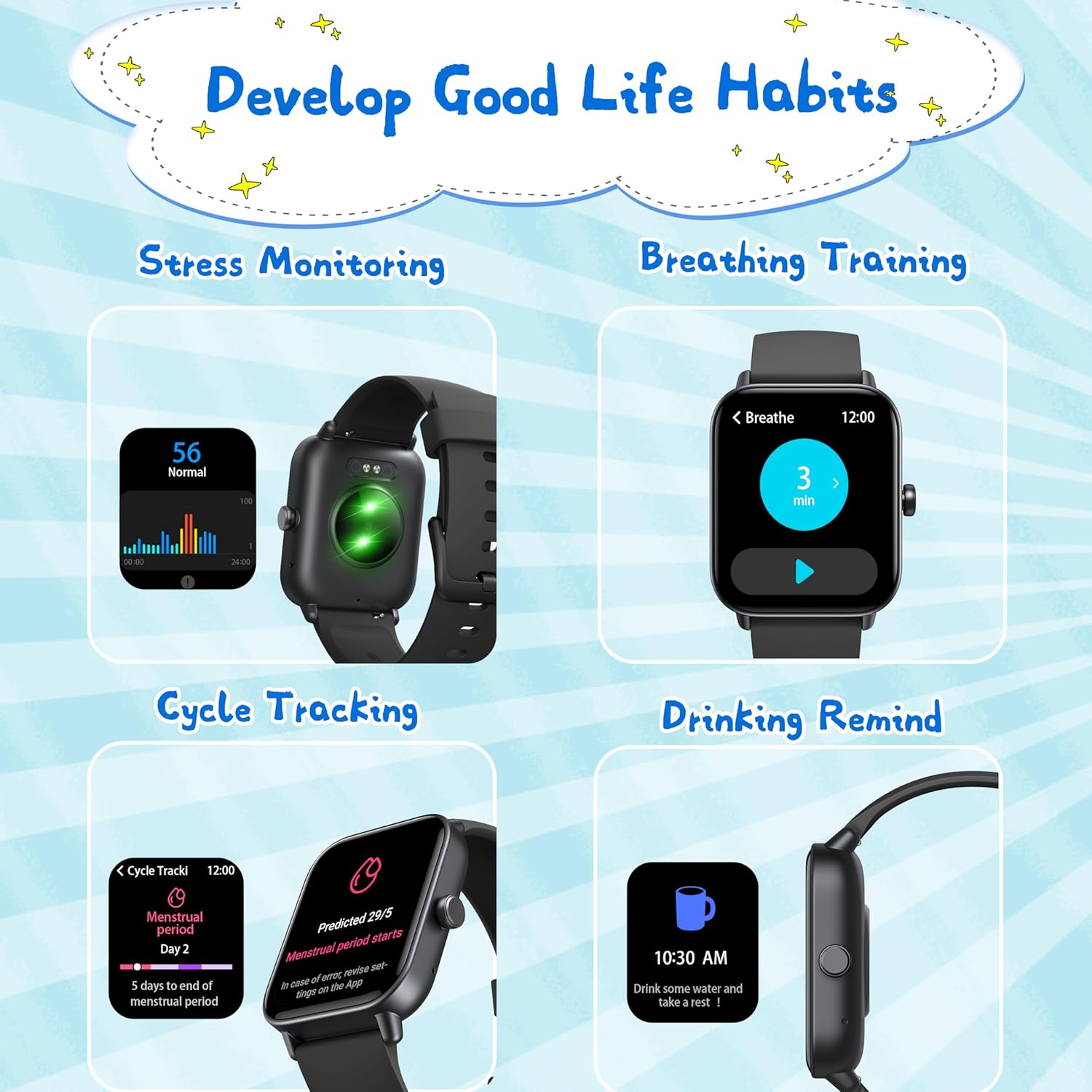 Stress Management Watch for Students: The smart watch for kids 8-12 can generate a stress pattern with all-day stress detection, remind the students to wash hands, drink water and stand up to walk. And the smartwatch can log adolescent girls’ periods cycles to remind period on time. It also equipped with lots functions, including alarm, stopwatch, timer, weather forecast, music control, find phone etc.