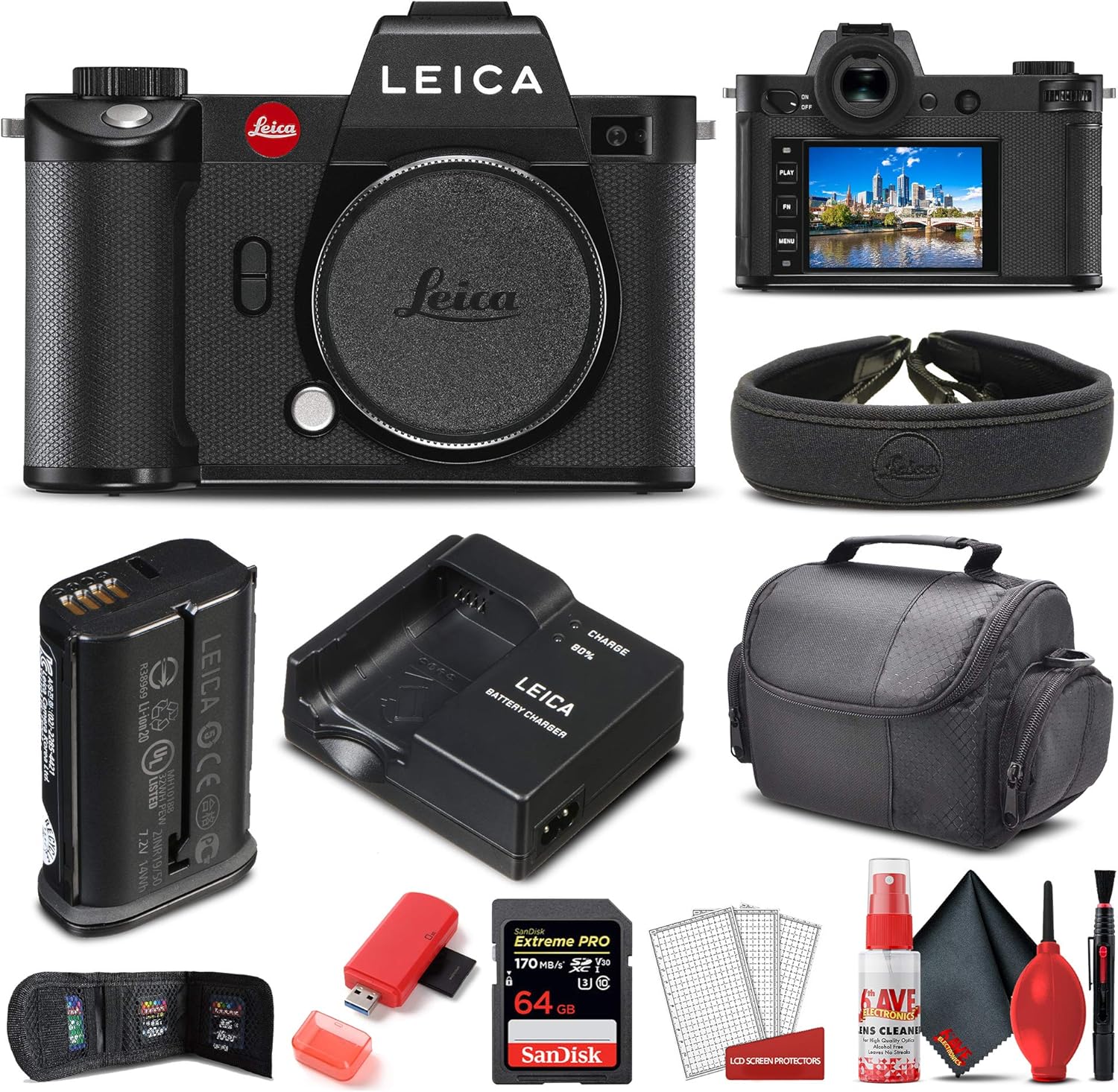 BUNDLE INCLUDES: 1 x Leica SL2 Mirrorless Digital Camera (Body Only), 1 x SanDisk 64GB Extreme PRO UHS-I SDXC Memory Card, 1 x Memory Card Reader, 1 x Deluxe Soft Case, 1 x Deluxe Cleaning Set, 1 x Memory Card Wallet