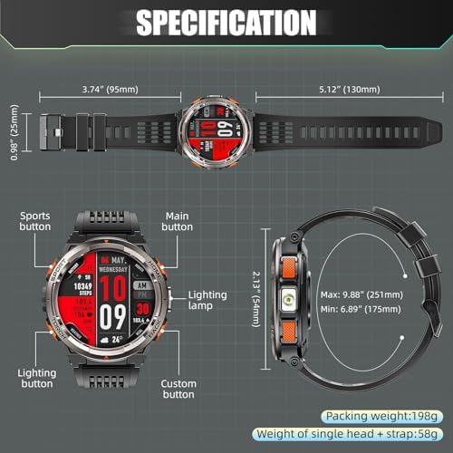 【Multifunctional Life Assistant】- LaNikar smart watch with LED flashlight is equipped with a 1.45″ high-definition screen and 360*360 high-definition resolution, providing you with a perfect operating experience. The military smartwatch has many practical functions such as weather, remote control music and photography, stopwatch, timer, alarm clock, mobile search, calculator, etc. There are also more than 100 dials to choose from, which is the best assistant for your smart life!