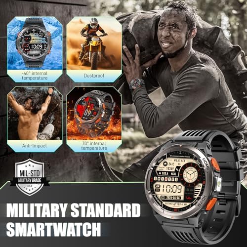【Military Standard & 3ATM Waterproof】- LaNikar military smart watch for men uses aerospace-grade metal, a 9H excellent hardness glass screen, and a fully enclosed 3ATM waterproof design, which is strong enough to withstand extreme environments and tests. LaNikar tactical smartwatches for men have passed multiple military-grade tests such as extreme temperatures, low pressure, dust resistance, and water resistance. In daily life, you can also wear it for swimming, diving, and other water sports!