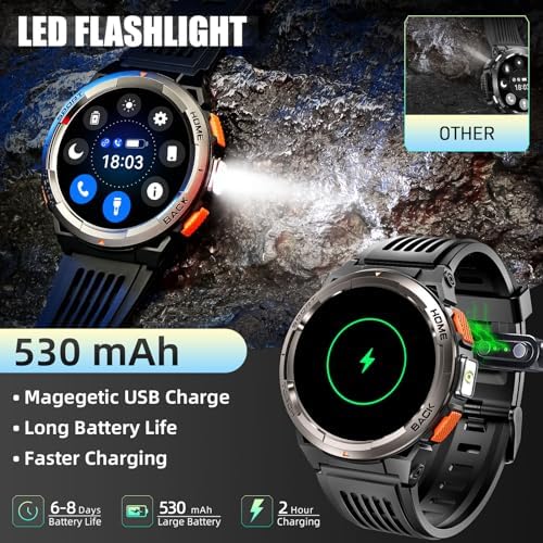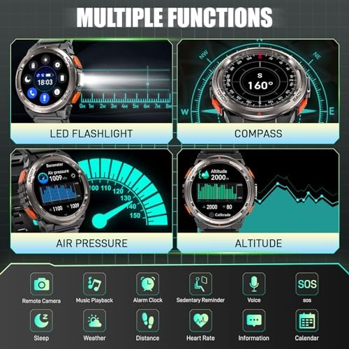 【Essential for Outdoor & Travel】- LaNikar rugged smart watch is equipped with a bright LED flashlight, with a lighting distance of up to 6-8m, and a built-in 530mAh large battery to ensure battery life, so you are no longer afraid of the dark when traveling! The outdoor smart watch adds the latest compass altitude and barometer functions to help you pay attention to the direction, altitude, and air pressure in real-time when outdoors, allowing you to move forward bravely and explore the world!