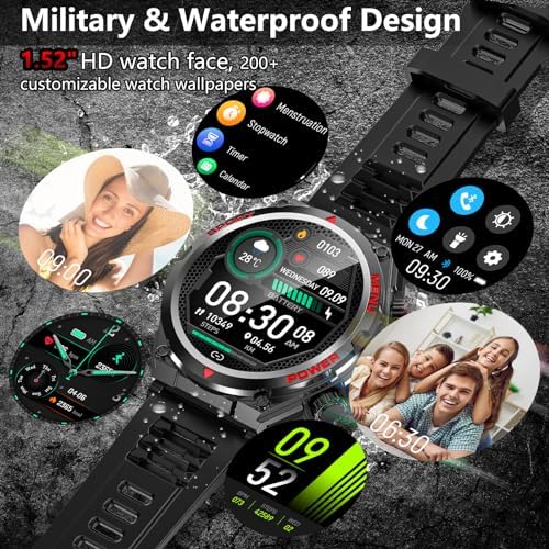 Military Smart Watch for Men Women, 1.52″ HD Bluetooth Fitness Tracker for iPhone Android iOS , IP68 Waterproof Fitness Watch with Answer, Make Call, Heart Rate, Sleep Monitor, 100+ Sport Modes -Black