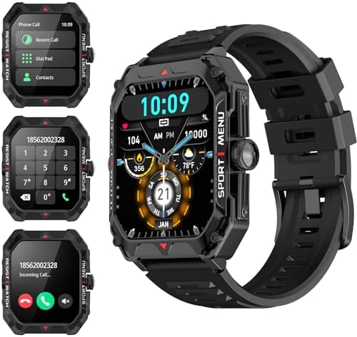 【Military Quality & Rugged Smart Watch】Engineered to military standards, the military smart watches for men is built to withstand the toughest challenges. Whether you’re hitting the gym, braving the great outdoors, or conquering the urban jungle, the rugged smart watch is up to the task. Bid farewell to the hassle of frequent charging with these mens smart watch for iphone and android phones. Enjoy an 7-12 days of use on a single charge, ensuring uninterrupted usage no matter where life takes you.