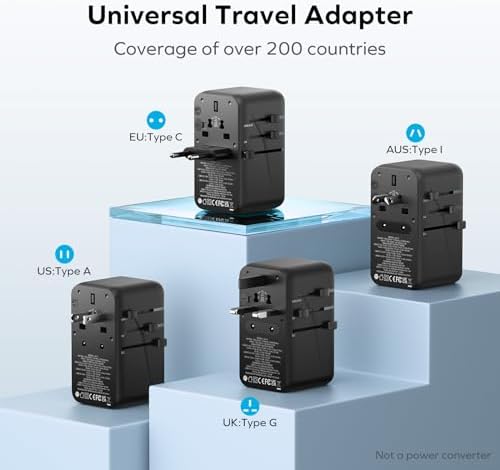 Worldwide Adapter – this all-in-one adapter is equipped with 4 different plug types could plug into the sockets of 200+ countries and regions: Type C (most popular type) for use in most of Europe, including France, Germany, Italy, Spain, Iceland, Greece, and many other countries; Type G for UK, Ireland, HK, Malaysia, Singapore; Type I for China, Australia, New Zealand, Argentina; Type A for USA, Mexico, Canada, and Japan. It does NOT work in India and South Africa.