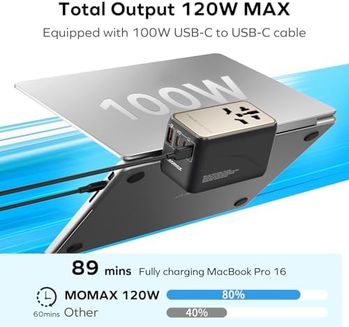 Portable and Safe – MOMAX advanced GaN technology compresses this travel plug adapter to a surprisingly compact size (3.68″ x 2.16″ x 2.11″) and lightweight (10.2 oz), In addition to GaN cooling and fireproof PC material, this international travel adapter also has 10A overload dual fuse, safety shutters and plug lock system, supporting short circuit, over-voltage, over-current protection, and with RoHS, CE, and FCC certifications which can effectively avoid the danger during charging, provide extra peace of your mind.(120w cable )