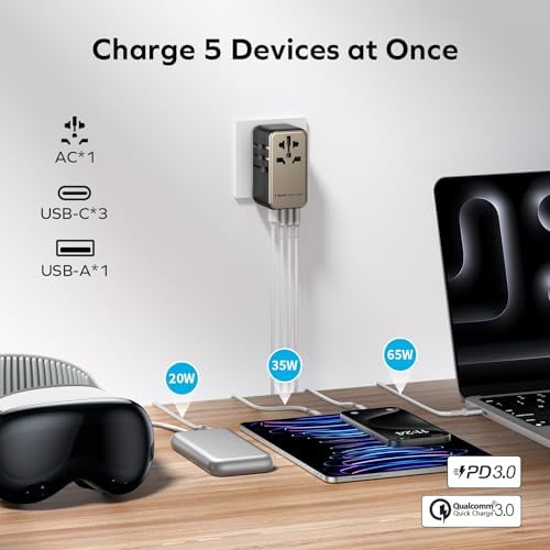 Total Output Up to 120W – This international adapter is equipped with 3 USB-C ports, 1 USB-A ports and 1 AC outlet (1250W Max in US) and supports PD3.0 & QC3.0 fast charging. The USB-C PD ports can even reach an incredible high speed of 100W, Bessides, it can fast charge two laptops simultaneously, It is ideal for your USB devices, especially laptop, smartphone, tablet, power bank, camera, Vision pro, etc.(100W USC Cable/Travel Pouh Include)