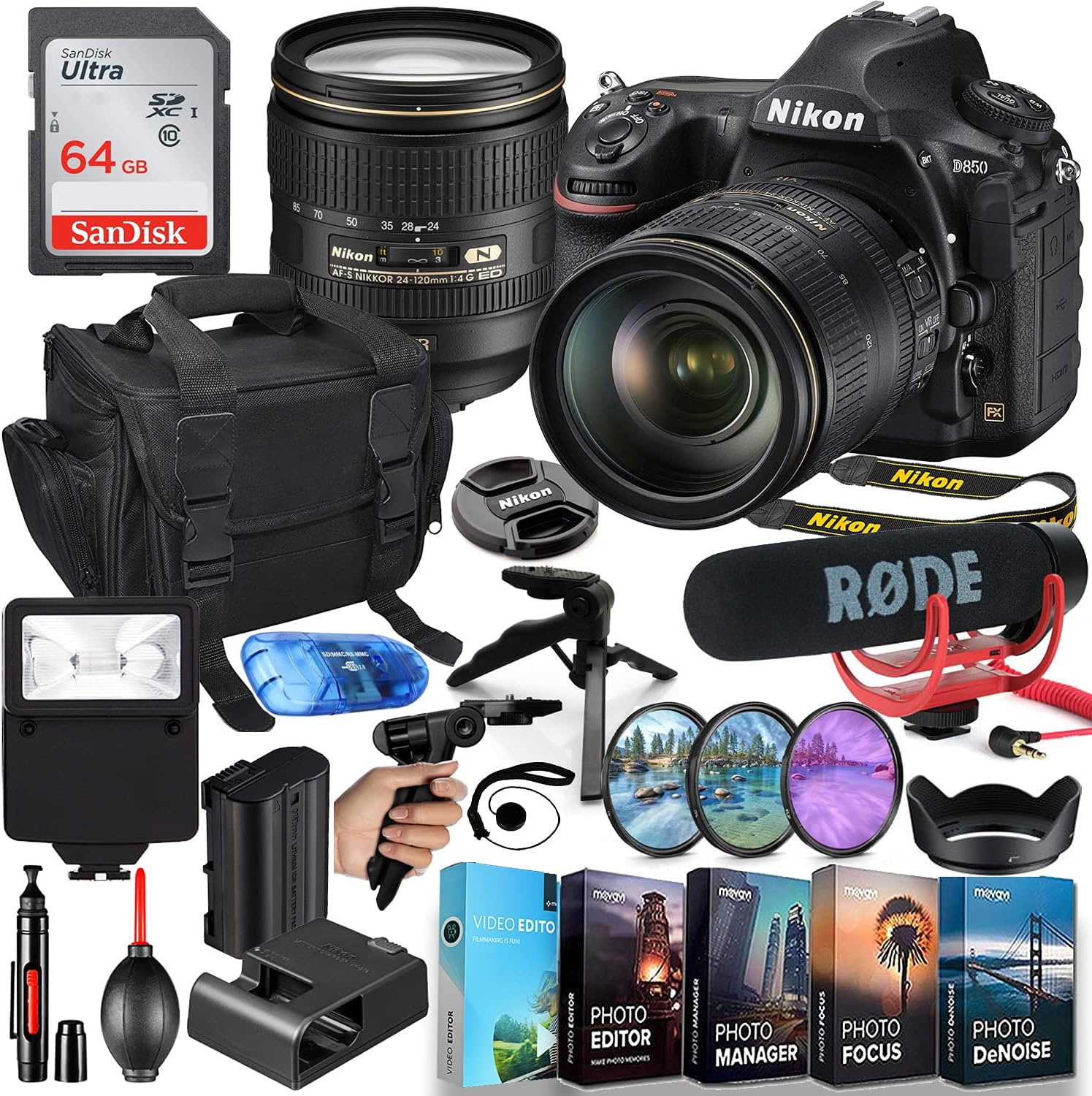 Bundled Items: Rode VideoMic GO Camera-Mount Shotgun Microphone, Sandisk 64GB High Speed Memory Card, Shoulder Bag, HD Filter Kit with UV-FLD-CPL Filters, Hand Grip Tripod, Video/Photo Editing Suite, USB Card Reader, Lens Pen and Blower, Lens Cap Keeper