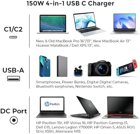 1 DC , 1 USB-A, 2 Type-C Ports 150W Quad-Port GaN Charger