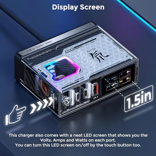 Real-Time Power Color LCD Display: This travel charger comes with a full-color touchscreen for intuitive user interaction. Interactive LCD display screen shows you the Volts, Amps and Watts on each port which can be viewed in real-time charging state, input output power, etc. Supporting touch button and APP bluetooth control. Hundreds of dynamics screensaver random switching.