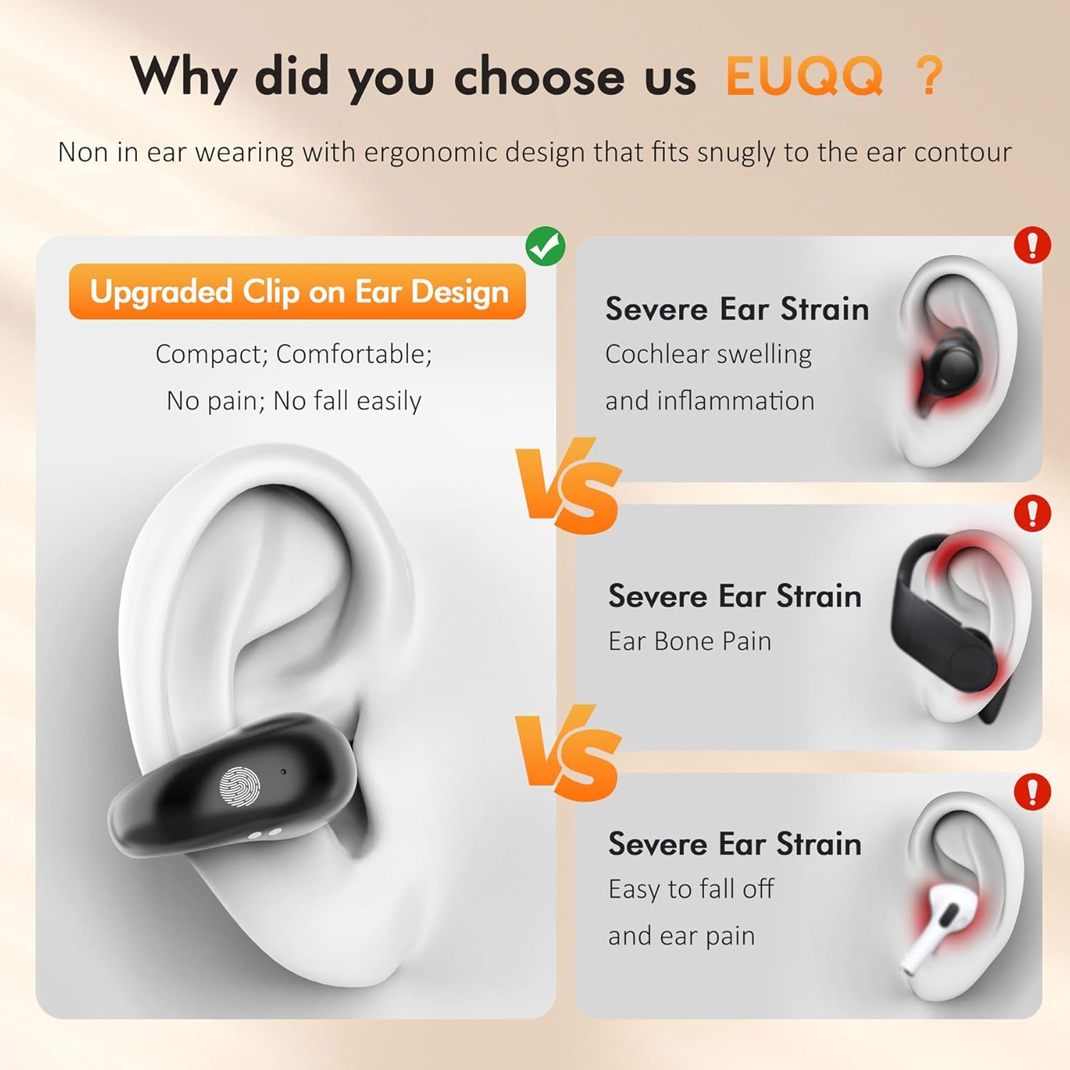 Open-Ear Design: Open Ear Clip Bluetooth Headphones feature a revolutionary ergonomic design unique listening experience by allowing audio to flow naturally without covering your ears. This design ensures you stay aware of your environment, which is perfect for outdoor activities like running, cycling, or commuting. The open bluetooth earphones has a unique shape, without being plugged into the ear canal, no longer pain your ear because of long time wearing.
