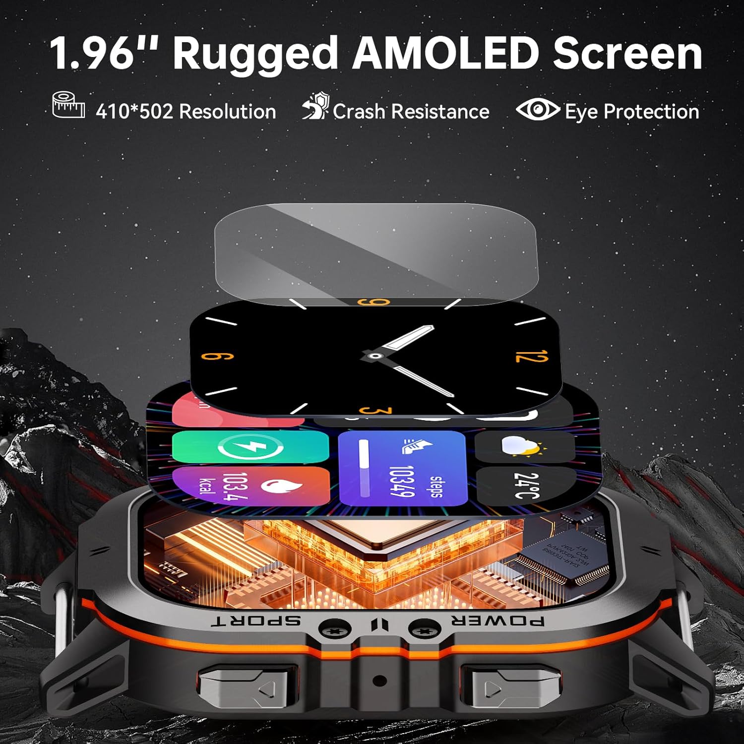 HD AMOLED Touch Screen — Military smart watches for men with 1.96” HD touch screen and 410×502 pixels, 5 adjustable brightness levels, so you can see the watch clearly in strong outdoor light. Built-in rich UI, 7 local classic UI and nearly 200 UI in the APP store.