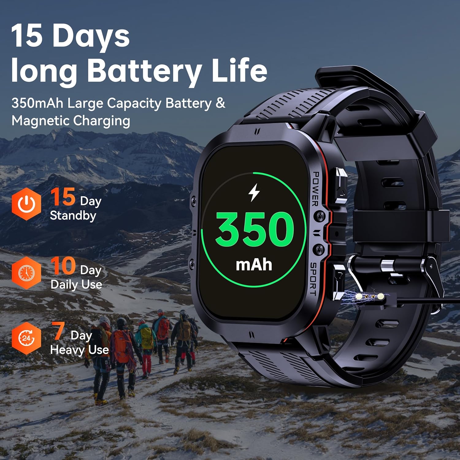 Military-grade Smart Watch — Smart watches for men is made of a special aluminum alloy material, 5ATM waterproof, withstanding harsh environmental conditions, making it the perfect companion for outdoor adventures, such as mountain climbing, adventure hiking, diving, skiing, crossing deserts, crossing glaciers, crossing jungles.