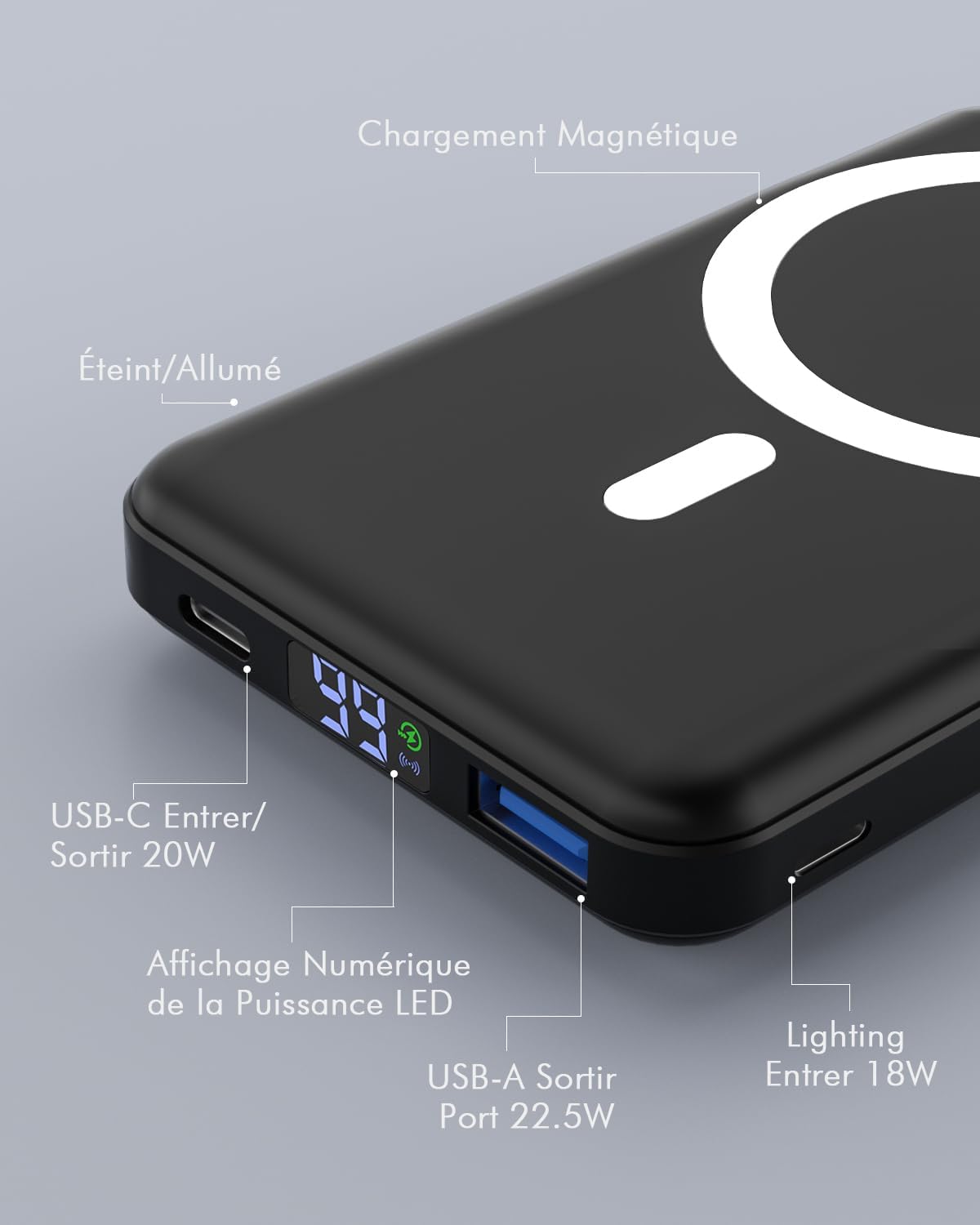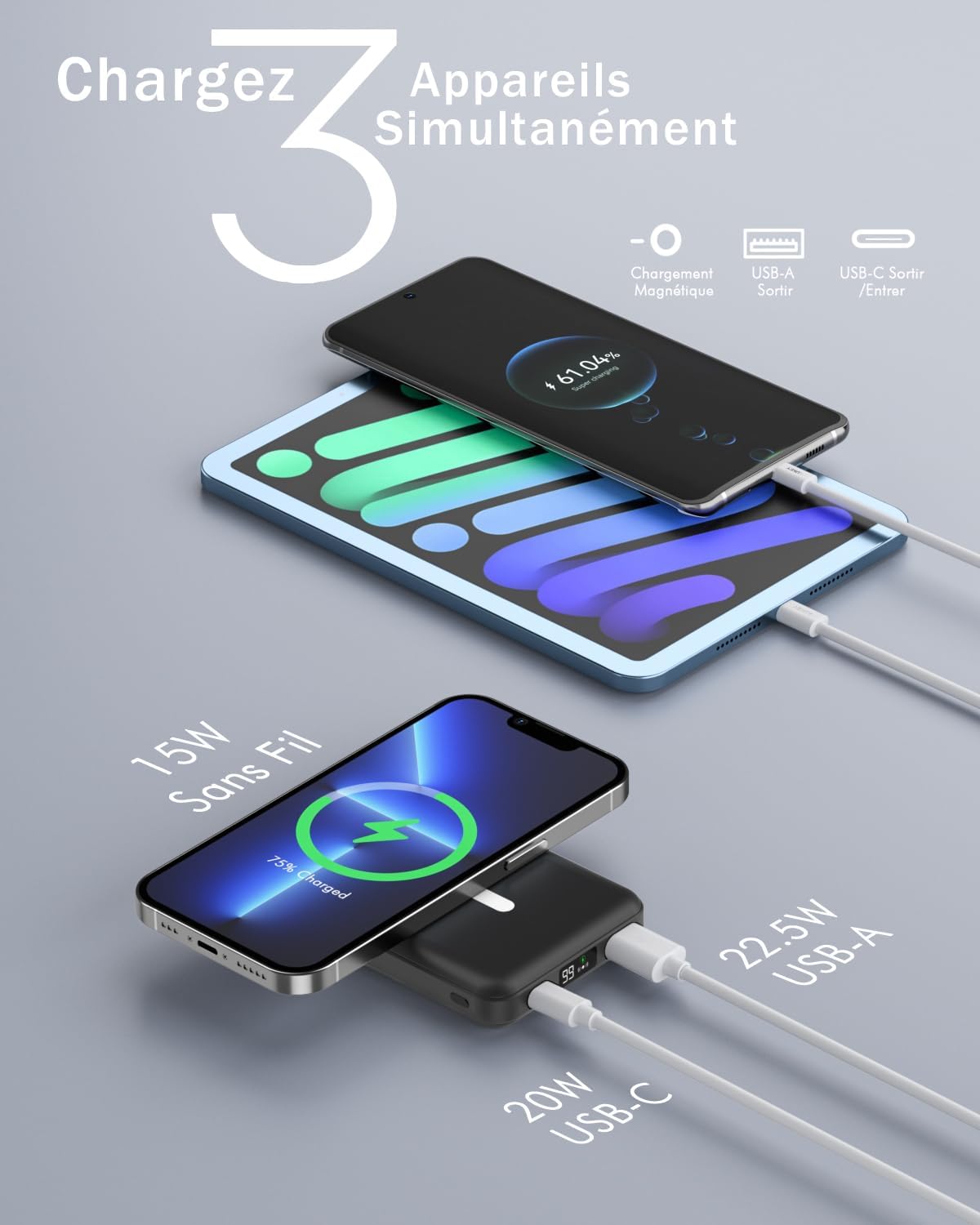 Strong Magnetic & Fast Charging Power Bank: Magnetic portable charger adopts the latest magnetic suction technology, charging immediately after snap. Support 5W, 7.5W, 10W and 15W Max wireless charging, 22.5W max USB-A PD output and max 20W USB-C output; Support max 18W Lighting input and max 18w USB-C input; The wireless charger can charge 3 Devices at the same time, shared charging with no waiting. The battery pack charger portable for iphone ensures faster charging speeds