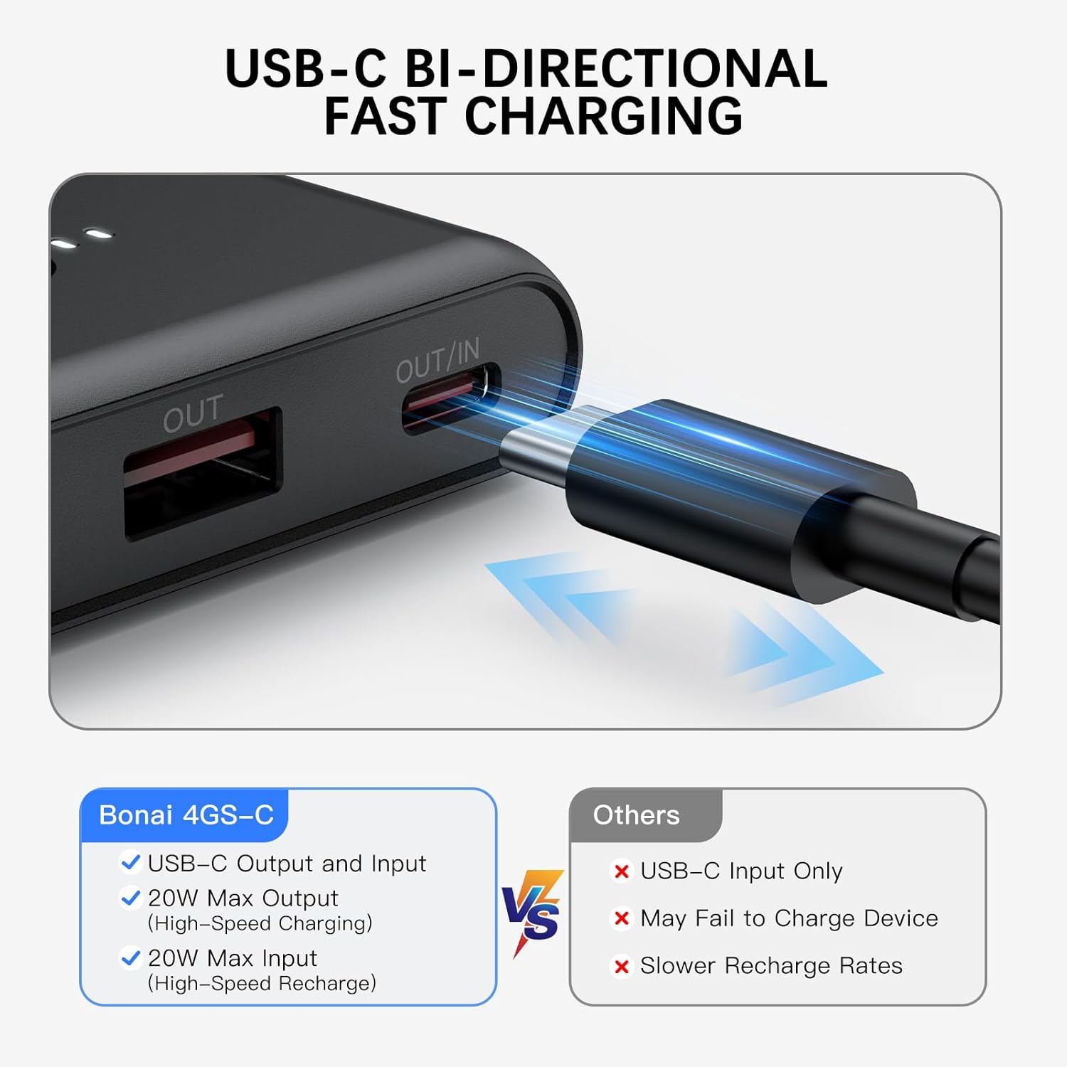 USB-C Bi-directional Fast Charging: The portable charger USB C port supports high-speed input and output functions (both 5V/3A). It only takes 3.5 hours to fully recharge the powerbank, no more overnight charging.