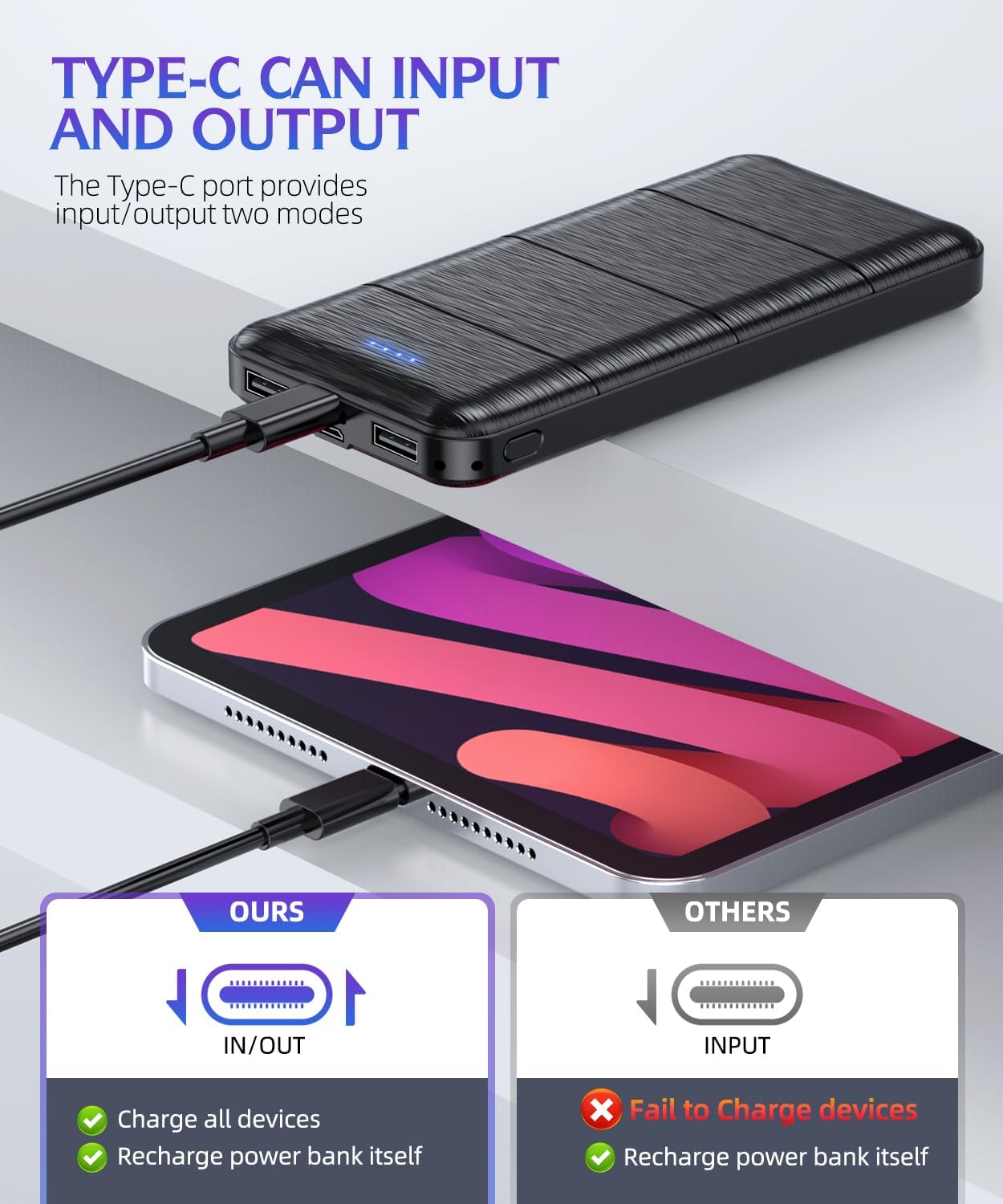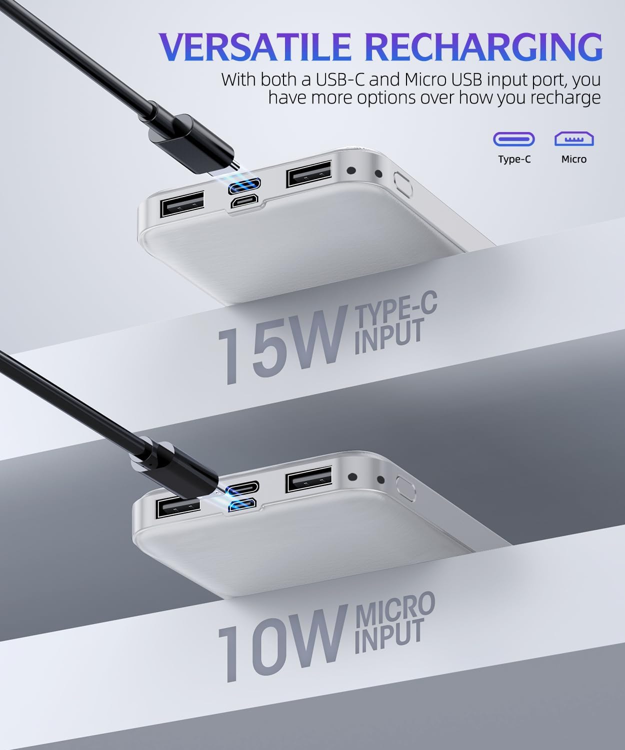 Power bank is equipped with USB-C and Micro USB input ports, which can fully recharge itself in just 4-5 hours at 5V 2.0A.(Note: Type-C ports support input/output) . Its portable design allows you to stay connected without being tethered to a wall socket, providing convenience and freedom wherever you go.